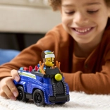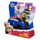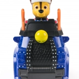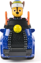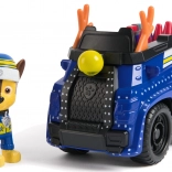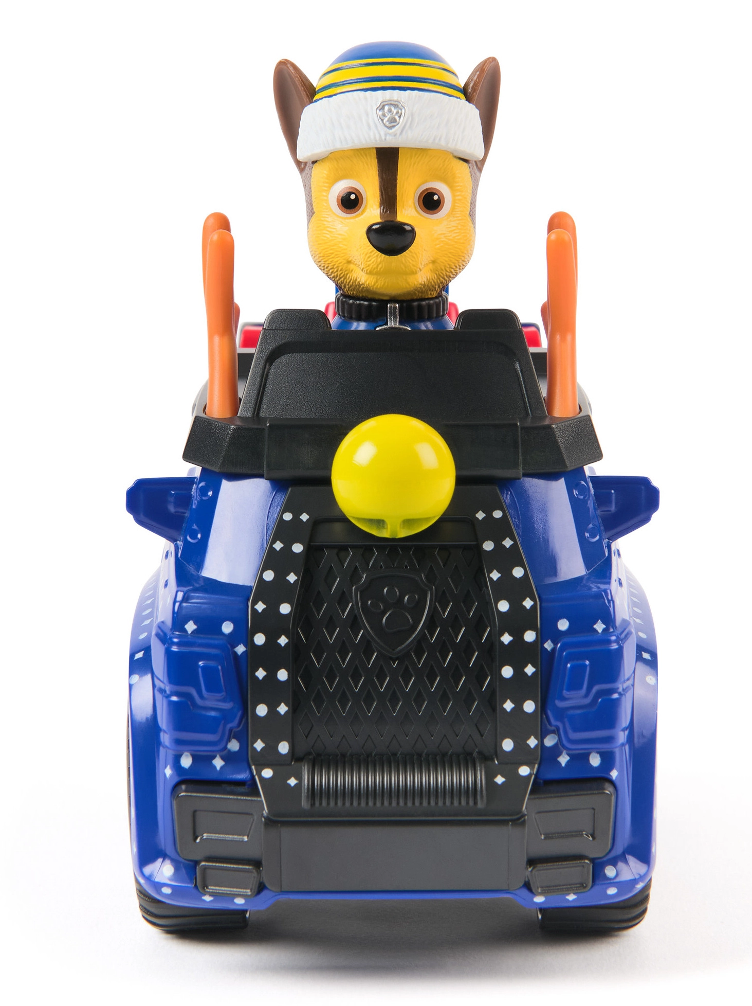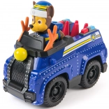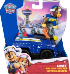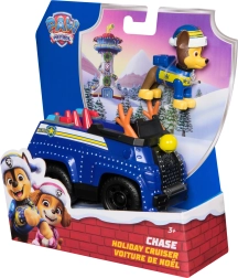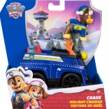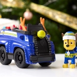 Detaljeret blå bil med julede elementer og bevægelige hjul. CHASE-figuren med vinterhue sidder direkte i cockpittet og er klar til action.