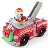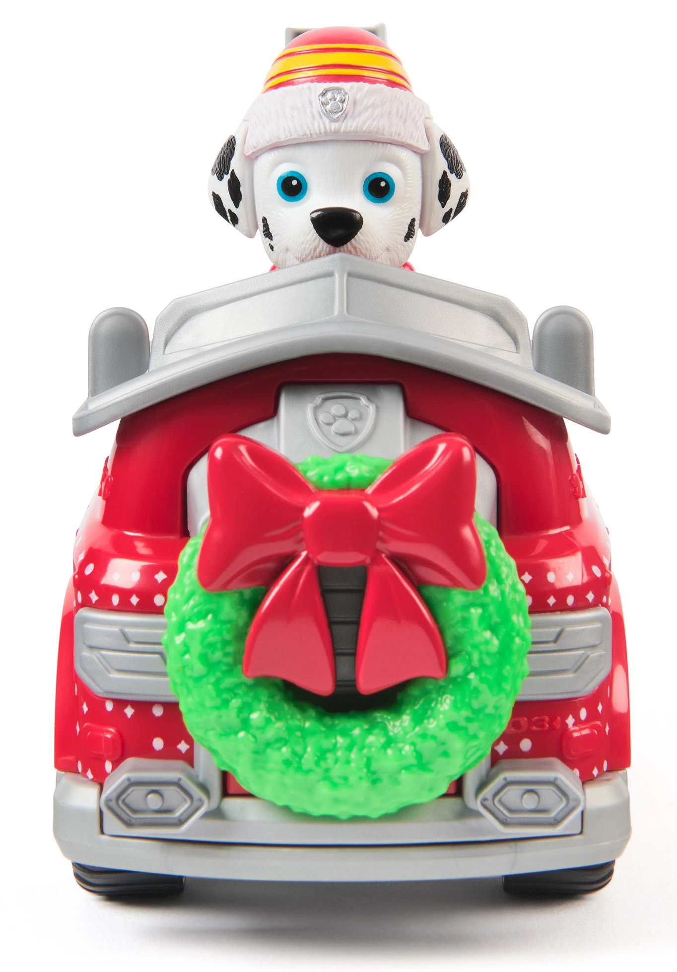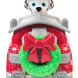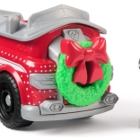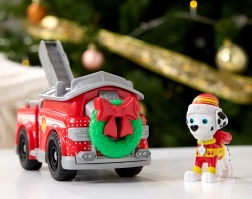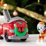 Den røde brandbil er pyntet med en grøn krans med sløjfe og vintermotiver. Marshall i varm hue gør enhver mission klar til vinteren.