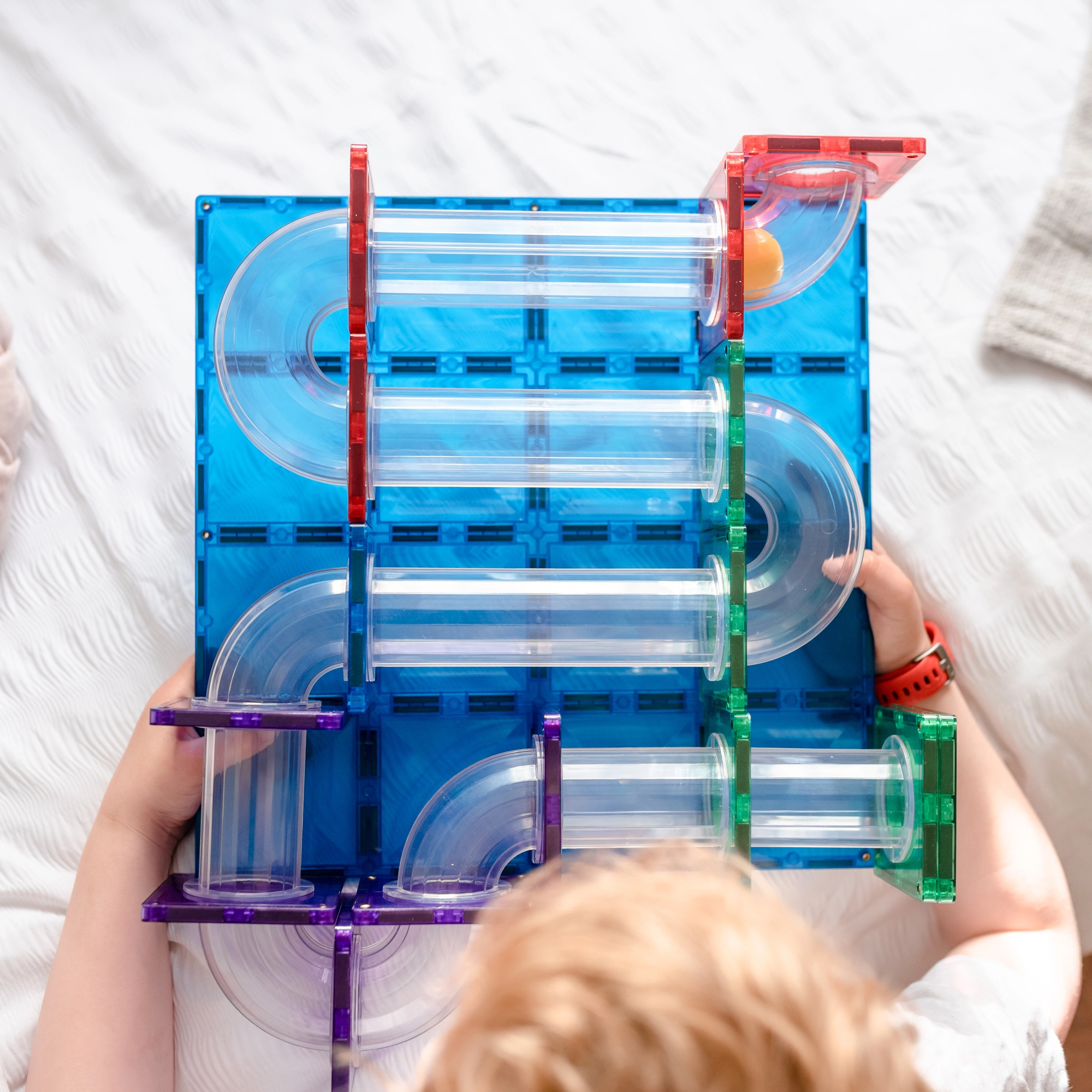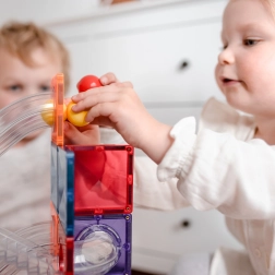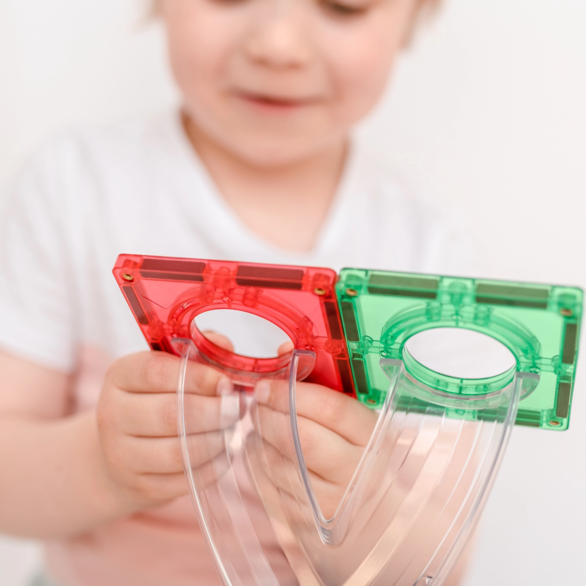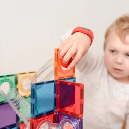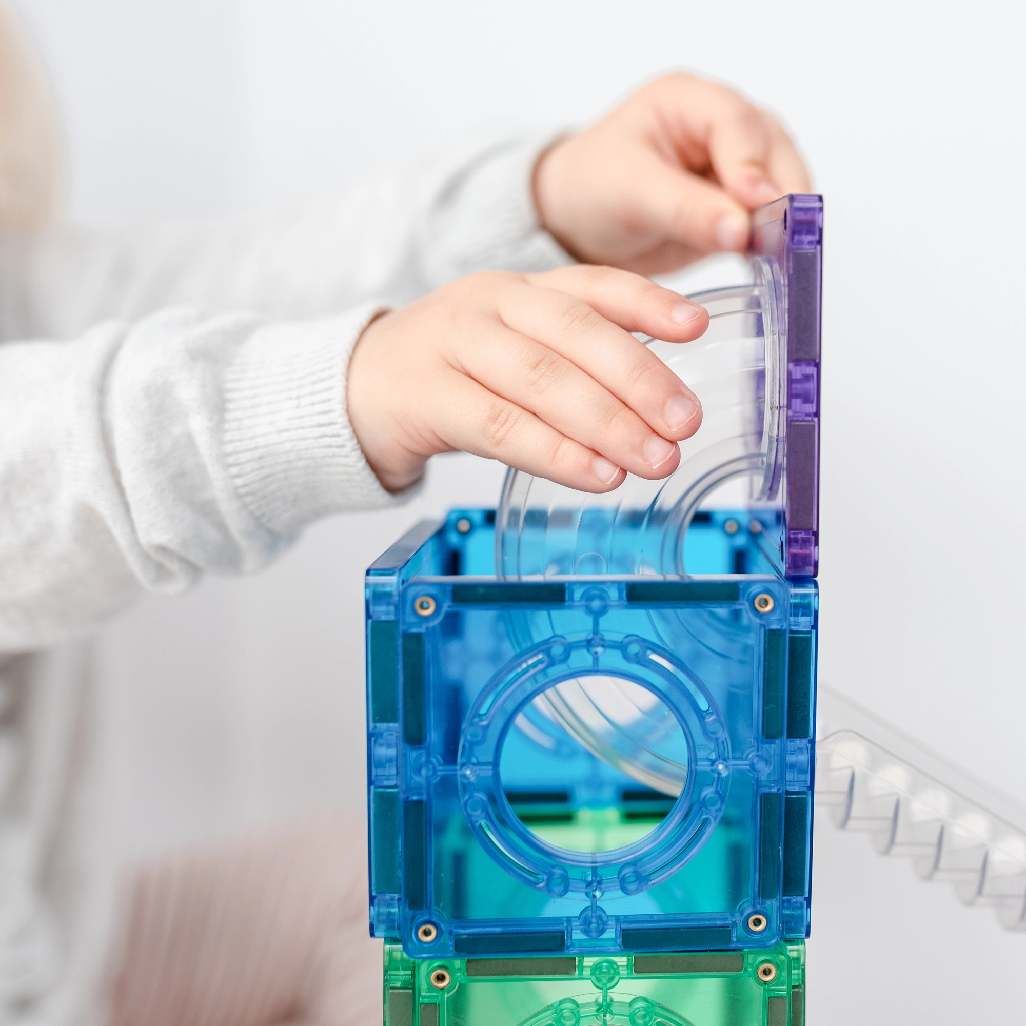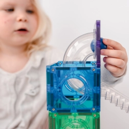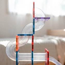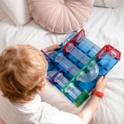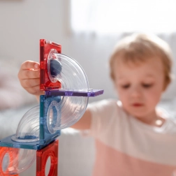 Byg farverige tårne, broer og gennemtænkte kuglebaner, følg kuglernes vej gennem gennemsigtige tunneller, og udforsk principperne for tyngdekraft, fart og balance. Connetix‑fliser i regnbuefarver har fast nittede magneter, som tiltrækker fra alle sider, så konstruktionerne står stabilt, og “klikket” ved samling er særdeles tilfredsstillende.