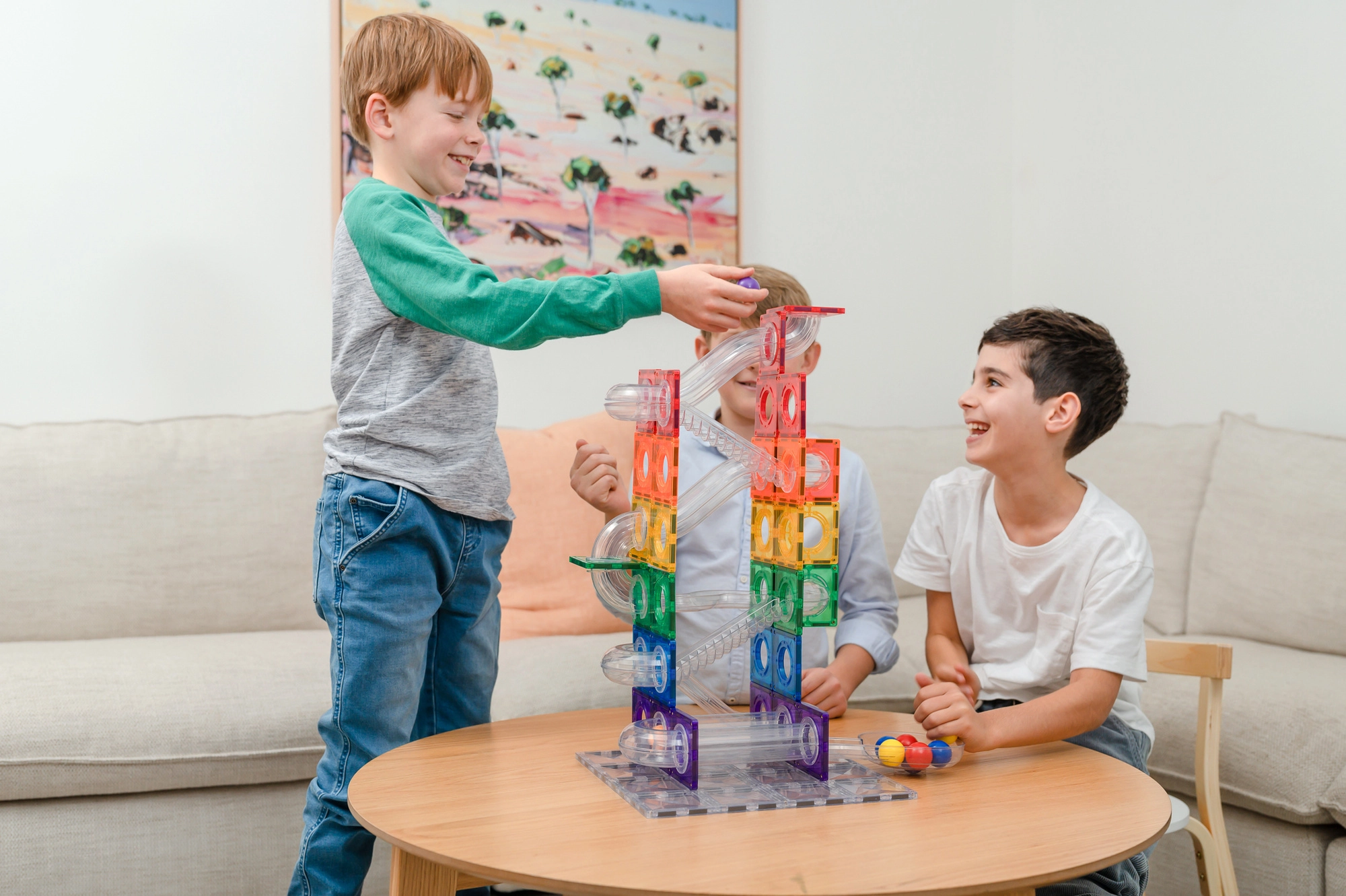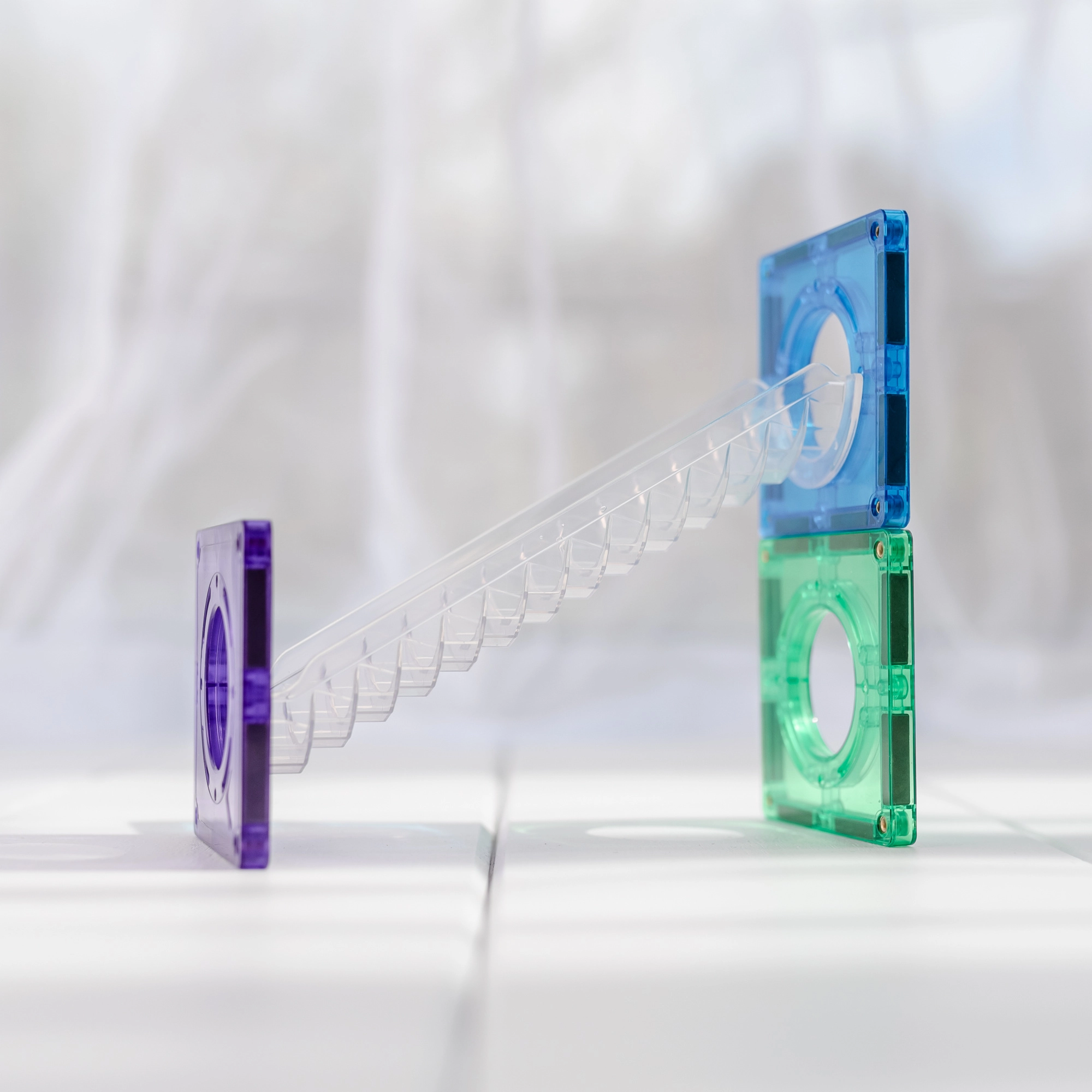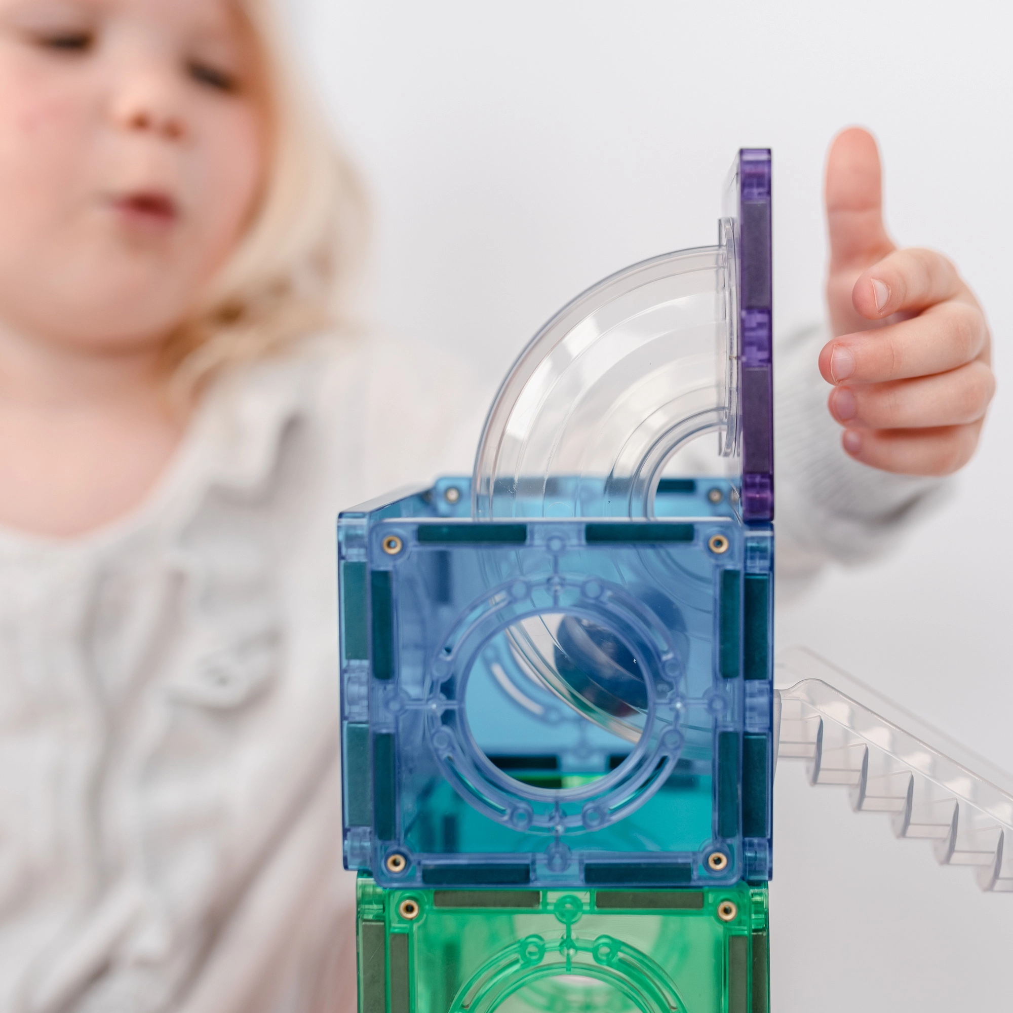 Byg farverige tårne, broer og gennemtænkte kuglebaner, følg kuglernes vej gennem gennemsigtige tunneller, og udforsk principperne for tyngdekraft, fart og balance. Connetix‑fliser i regnbuefarver har fast nittede magneter, som tiltrækker fra alle sider, så konstruktionerne står stabilt, og “klikket” ved samling er særdeles tilfredsstillende.