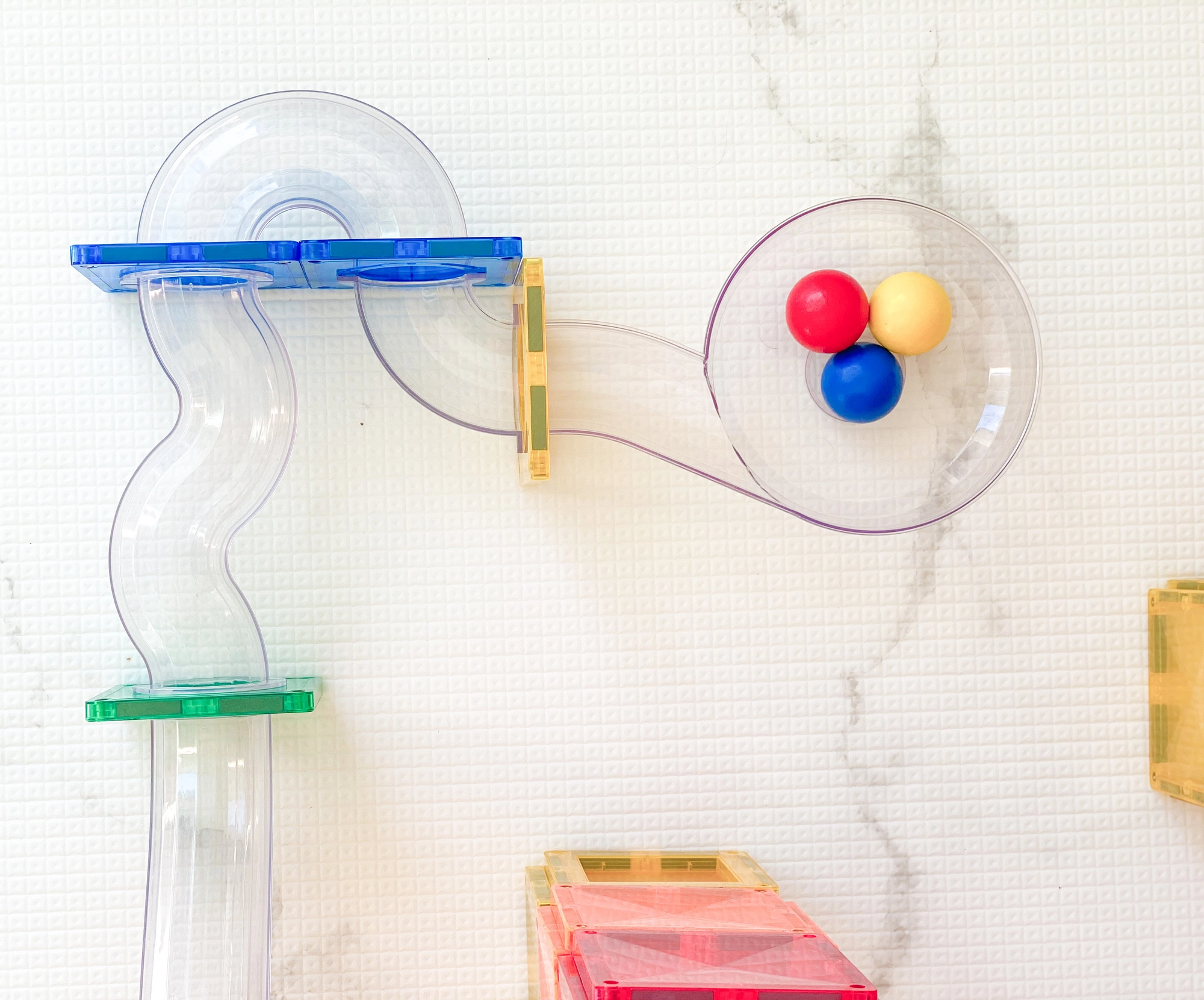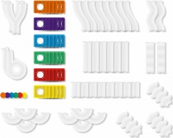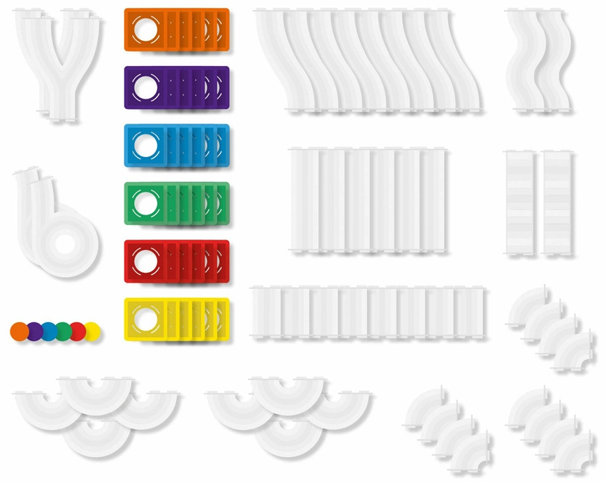 Klare rør, sving, S‑buer og Y‑stykker gør det muligt at følge kuglernes bevægelse og udforske fart, tyngdekraft samt årsag og virkning i forskellige opstillinger.