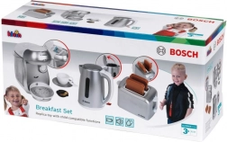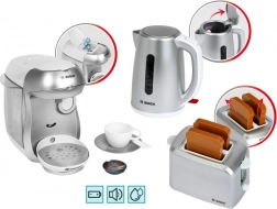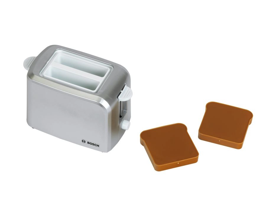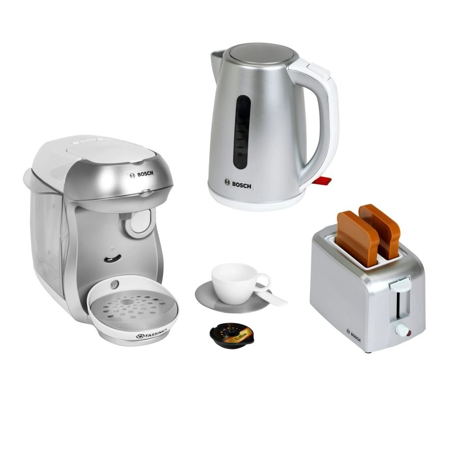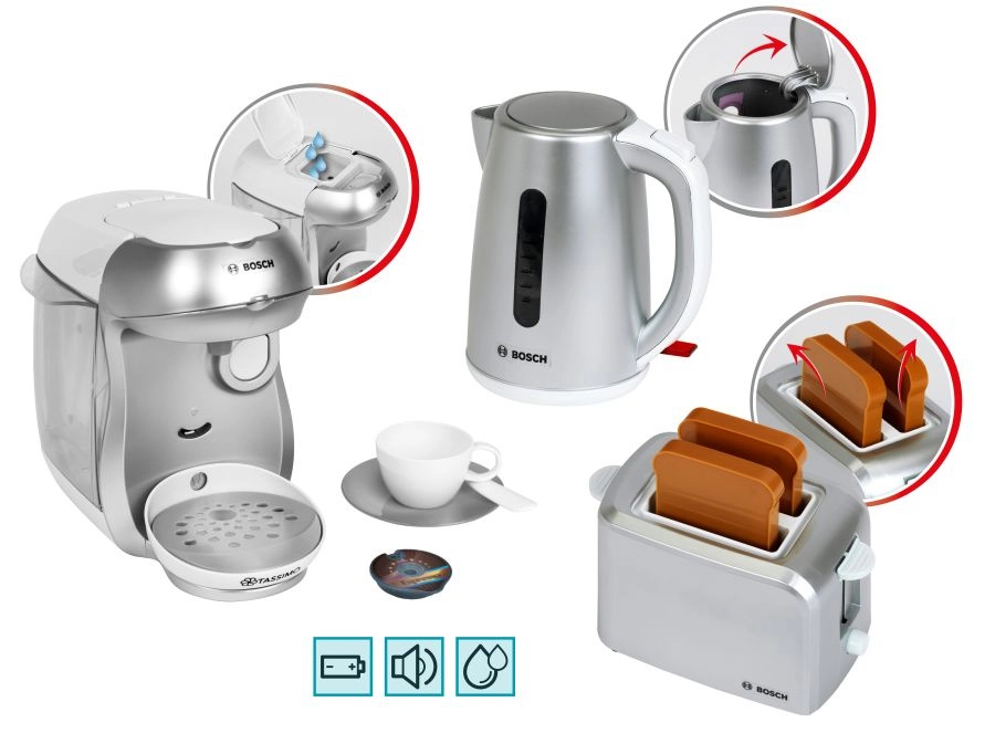 Sættet indeholder også en kompakt brødrister i grå med automatisk pop-up af to toasts, løftemekanisme og en drejeknap med imiteret regulering. Sættet fuldendes af en legetøjs-elkedel med åbningslåg og en kontakt for endnu mere realistisk leg.