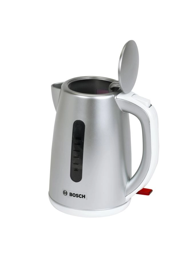 Legetøjskedlen i metallisk grå har ergonomisk håndtag, niveauvindue og et let åbnende låg for nem påfyldning af vand under legen.