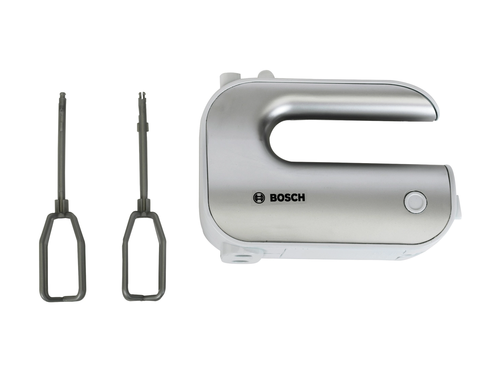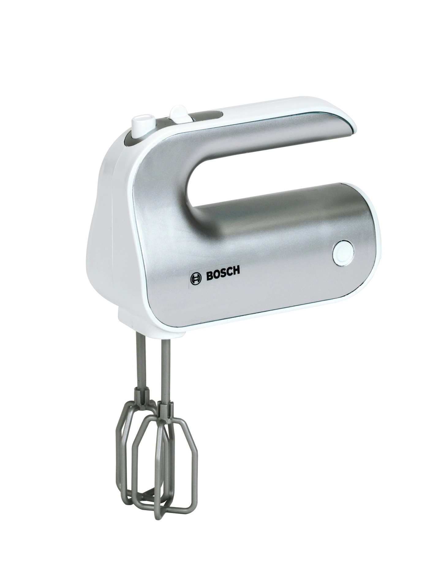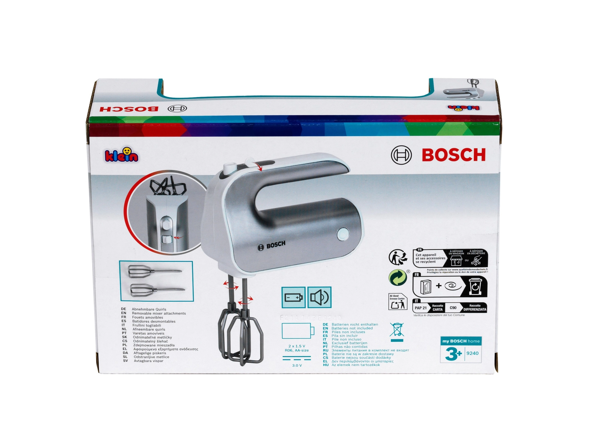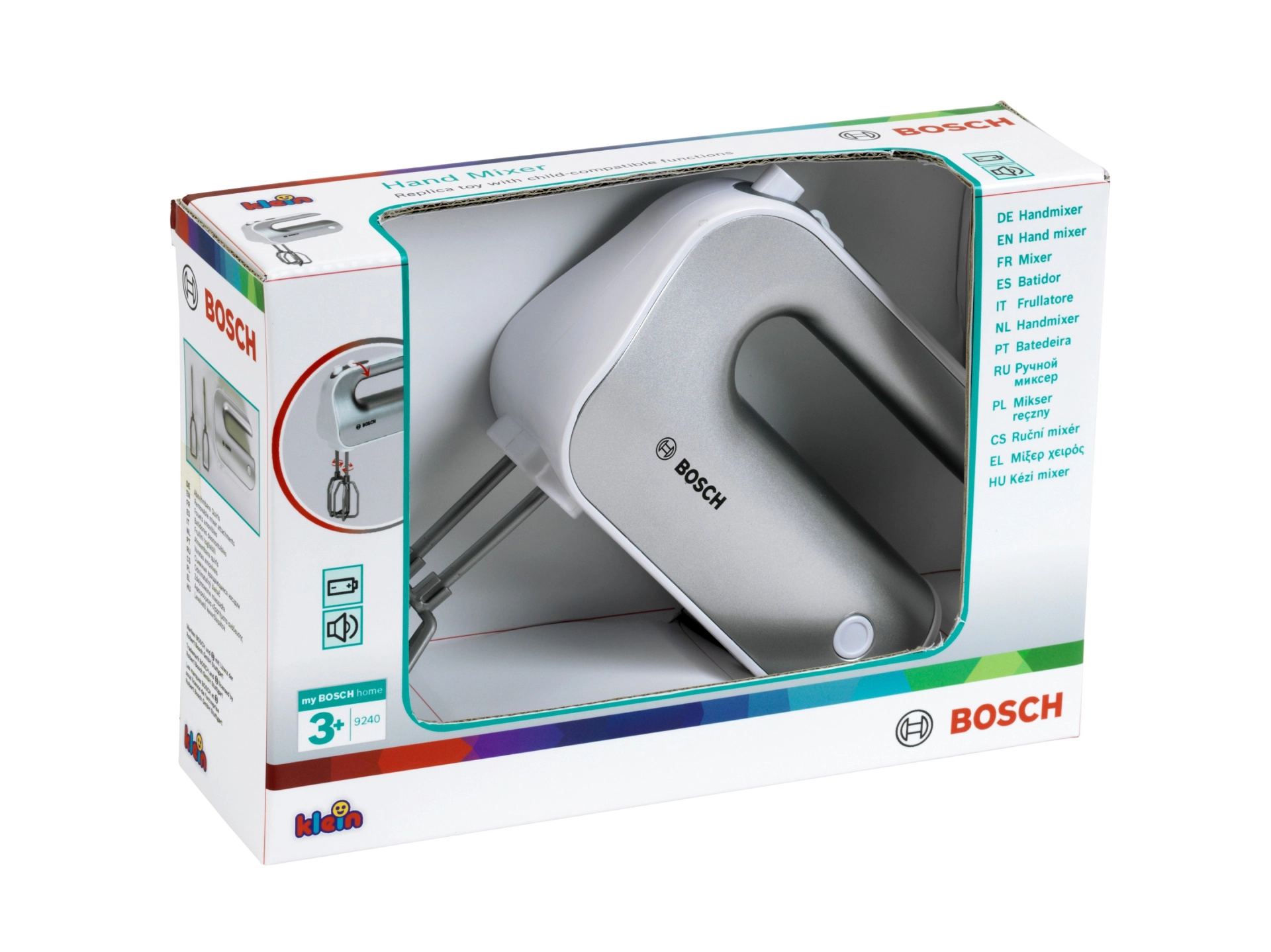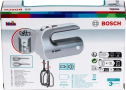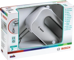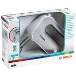 Giv børnene sjov som i et rigtigt køkken. Den licenserede BOSCH-mixer i sølvfarvet design efterligner troværdigt en ægte enhed: når knappen trykkes, roterer piskerisene, og en skydekontakt imiterer hastighedsindstilling. Takket være de aftagelige tilbehør lærer børn også gode vaner omkring orden.