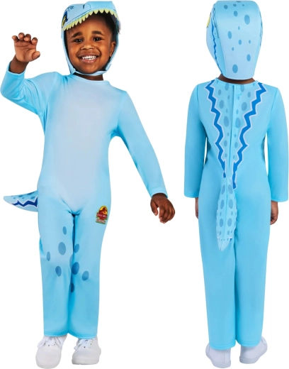 Hætte formet som et dinosaurhoved, pletteret print og dekorativ rygkam giver kostumet et troværdigt Velociraptor-look fra JURASSIC WORLD.