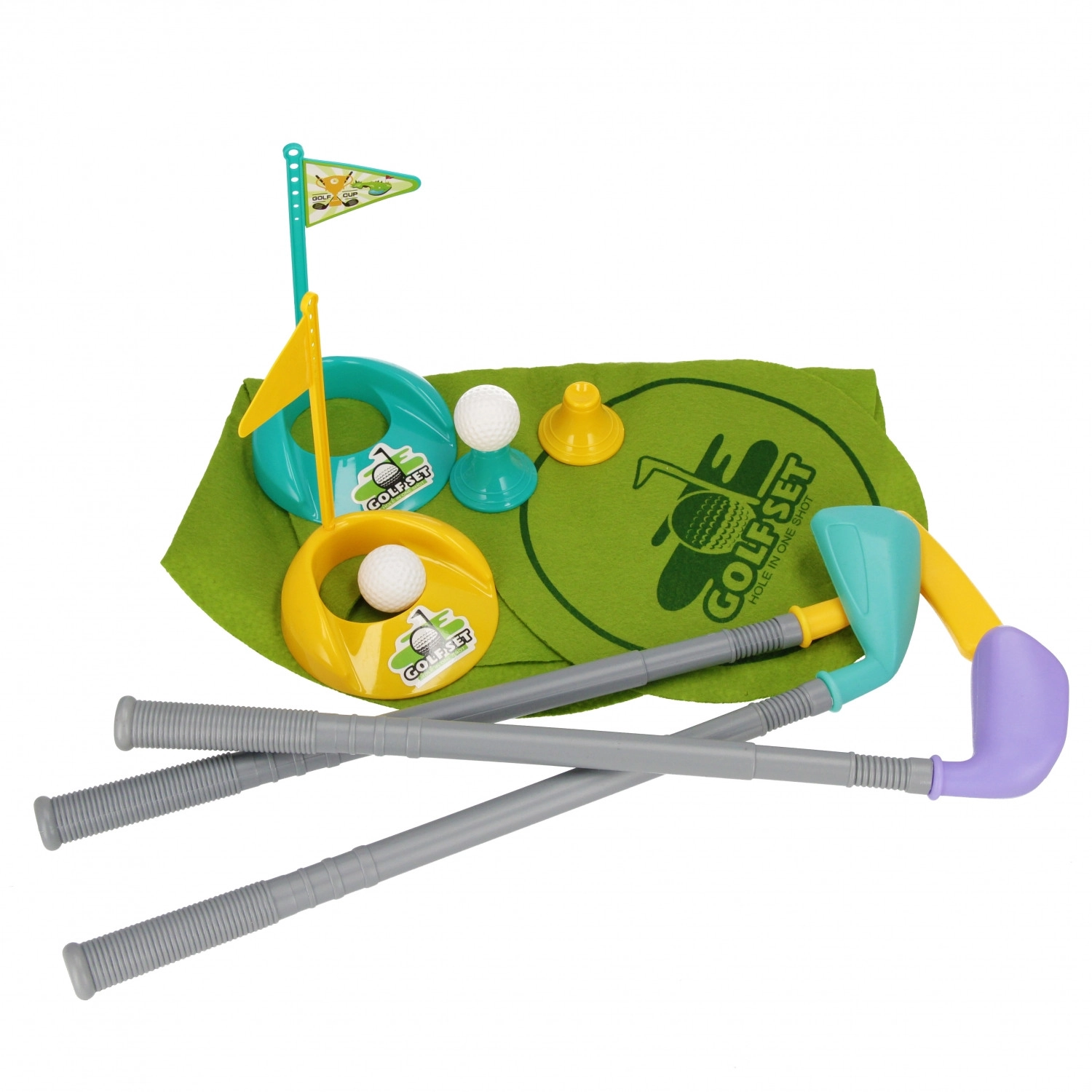 Alt hvad børnene behøver for at spille med det samme: tre køller, to huller med flag, to bolde og en måtte til puttingtræning.