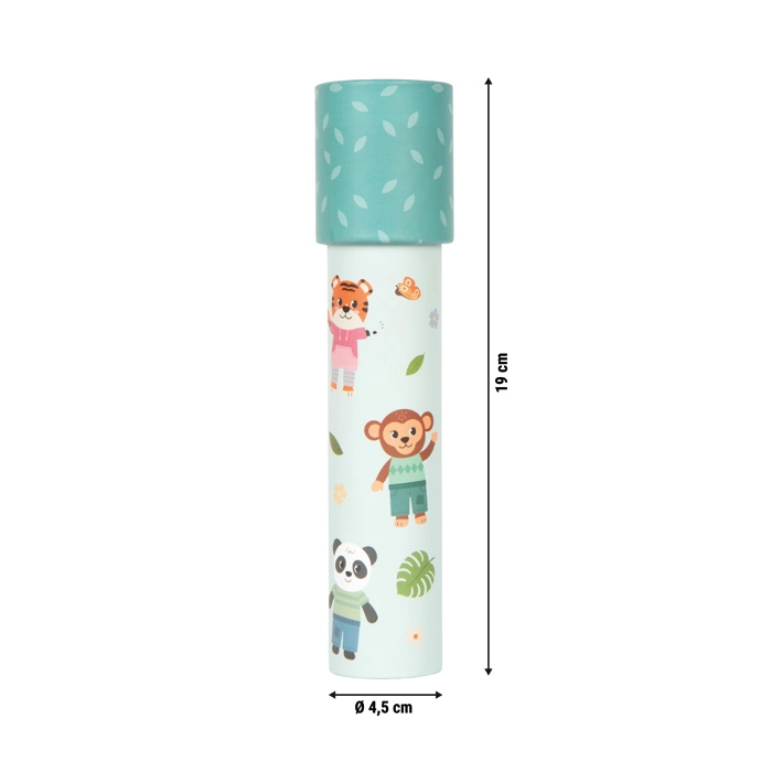 Kalejdoskopet Junglevenner SMALL FOOT glæder børn fra 3 år med et legende design med motiver af tiger, elefant, abe, zebra, panda og flodhest. Ved hvert drej opstår der nye geometriske mønstre, som stimulerer fantasien og lærer børn at genkende farver og former.