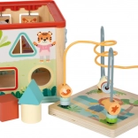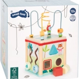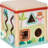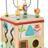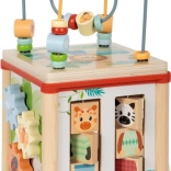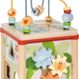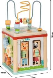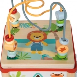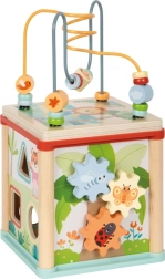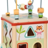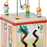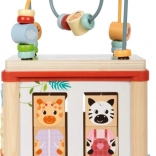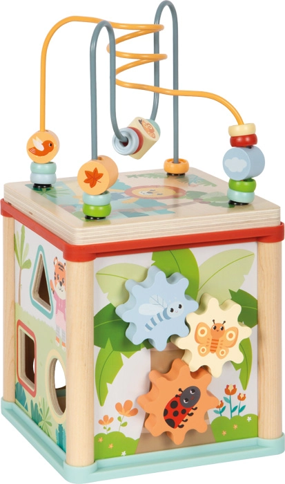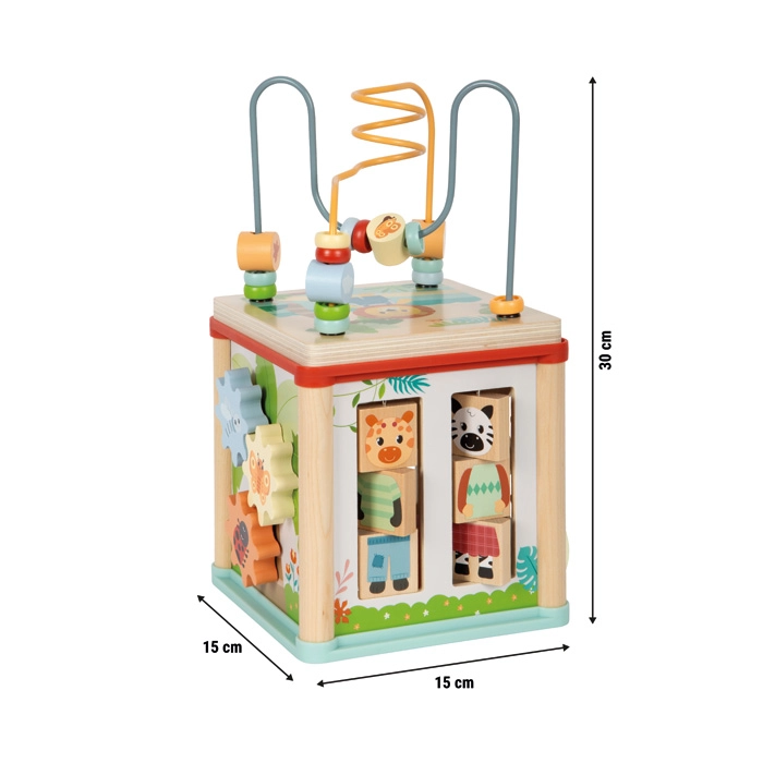 Den multifunktionelle træ-motorikterning af certificeret FSC-træ giver børn fra 12 måneder mange lege- og læringsmuligheder. Den byder på perlelabyrint, formsortering, tandhjul, skinner og drejeklodser med dyremotiver. Det kompakte design med aftageligt låg, der kan opbevares indeni, sparer plads, udvikler finmotorik, hånd-øje-koordination, form- og farveopfattelse og stimulerer børns kreativitet.