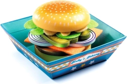 Med DJECO bistro Kelly & Johnny bliver børnene til små kokke og serveringspersonale. De samler en burger lag for lag, serverer pommes frites og en drik og laver deres helt egen menu. Delene i lakeret træ og blød filt ligger godt i hånden, er lette at stable og er ideelle til gentagen leg.