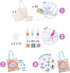 I pakken finder du alt, hvad du skal bruge for en nem start: farver, beskyttelsesudstyr og vejledning. Resultatet er farverige, holdbare motiver, der pynter tasker, poser og penalhuse. Et fremragende tip til en kreativ eftermiddag derhjemme eller som gave til små designere.