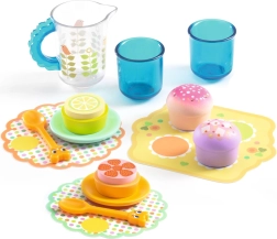 I det solide kartonrør med praktisk snorehåndtag finder du alt, hvad der behøves til en lille snack: kopper, tekande, tallerkener, skeer og søde godbidder. Sættet er let at rydde op og tage med overalt – på besøg, på legepladsen eller i weekenden hos bedsteforældre.