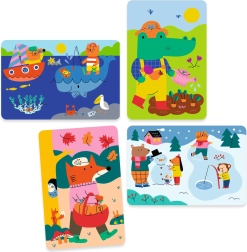Sættet indeholder 4 solide kort med glade dyr i forårs-, sommer-, efterårs- og vinteraktiviteter. Perfekt til at lære og tale om årstiderne.