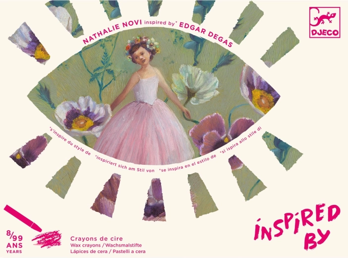 Sættet Djeco Inspired by Degas bringer børn tættere på impressionismens poesi gennem temaer om dans og bevægelse. Takket være fortrykte baggrunde og intuitive trin-for-trin-metoder opnår børn nemt imponerende resultater og får glæde ved at skabe.