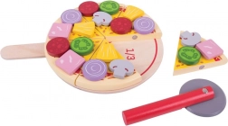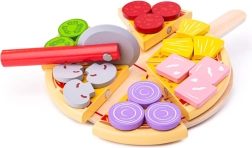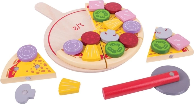 Seks pizzastykker med velcrosamlinger holder sammen og kan “skæres” med den medfølgende træskærer. Børn kan prøve realistisk skæring og servering.