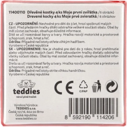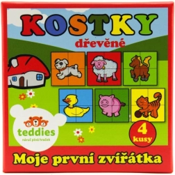 Træbilledklodserne Mine første dyr fra mærket TEDDIES er et fremragende valg til de første puslespil. Fire kvalitets træklodser i en praktisk papæske gør det muligt at samle seks forskellige motiver af husdyr. Børn får sjov både ved at lægge billederne og ved at bygge tårne, slotte eller små indhegninger til dyrene.