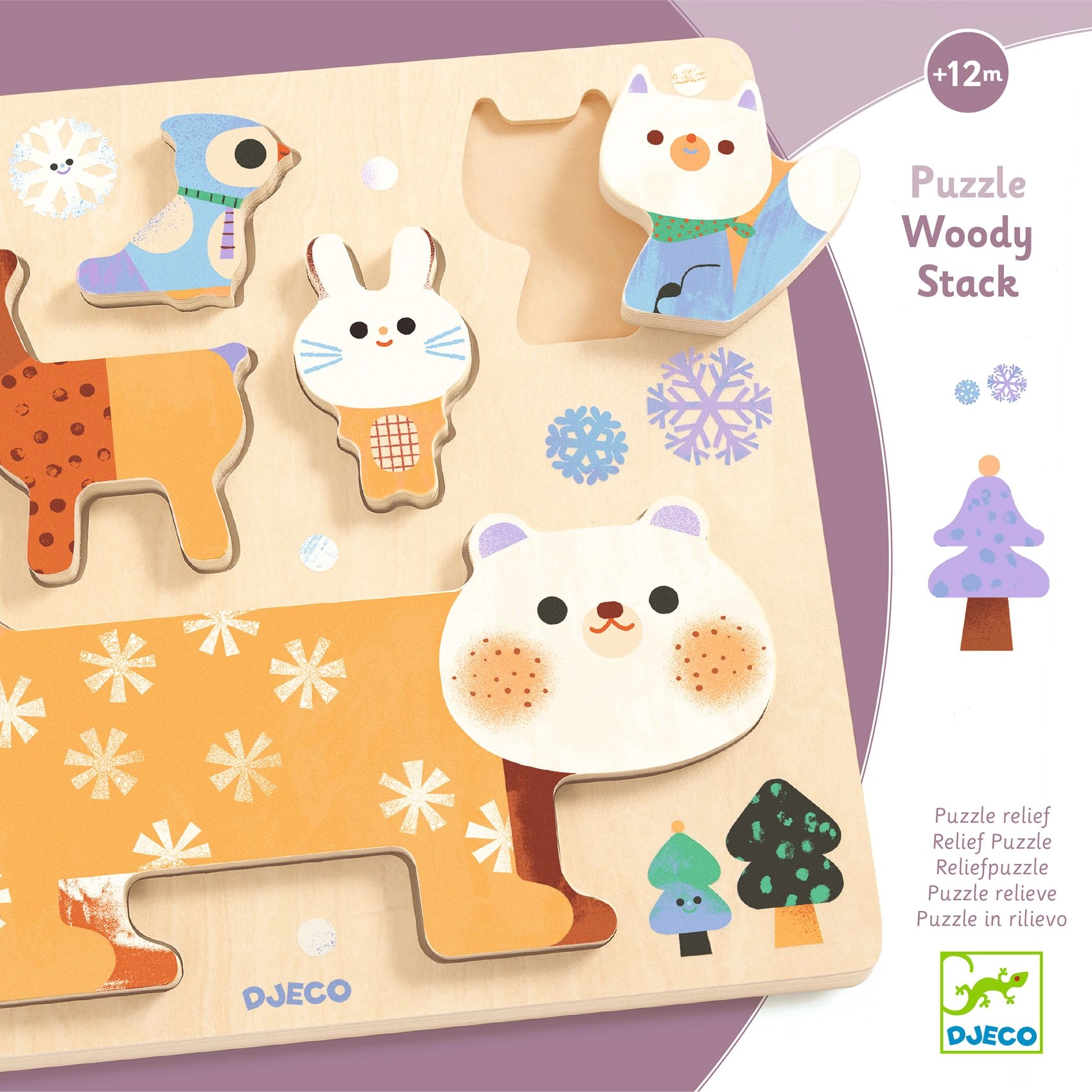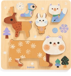 Denne sæt kombinerer klassisk indsætnings-træpuslespil med en balancerende tårnleg. De sjove dyr – bjørn, kanin, fugl, rådyr og ugle – kan lægges i brættet efter form eller stables til et tårn for at øve balance. Legen hjælper børn med at udvikle tålmodighed og rumlig forståelse.