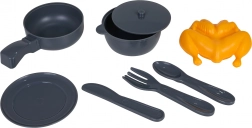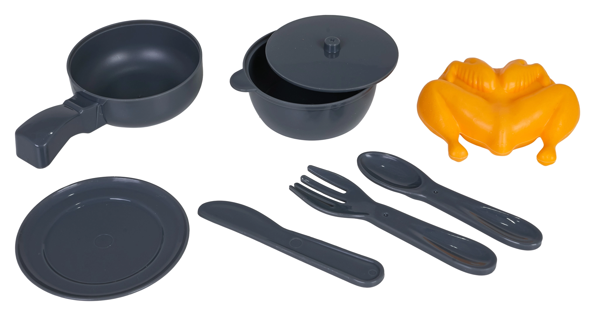 Inkluderer pande, gryde med låg, tallerken, bestik og en falsk kylling – alt til den fulde rolle som lille kok.