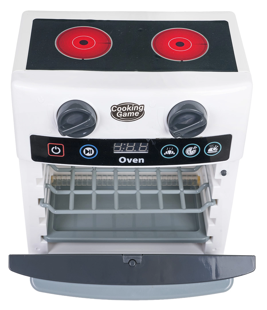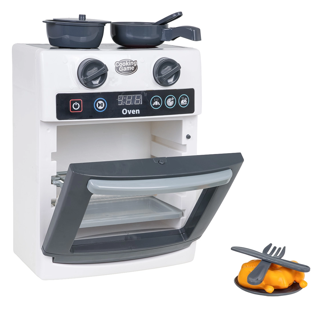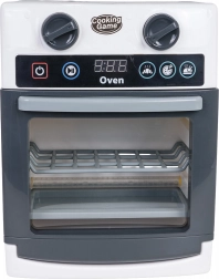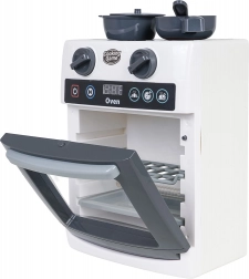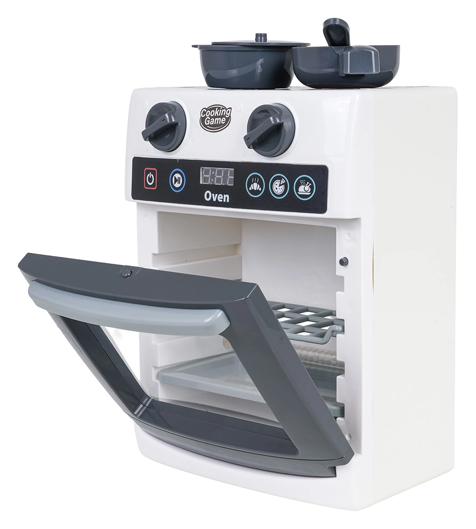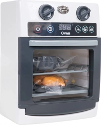 Denne børneovn efterligner troværdigt et rigtigt apparat – den har gennemsigtige låger, bevægelige betjeningshjul og et panel med timer. Under bagning lyser indersiden op, og der høres realistiske lyde ved åbning/lukning af låger, bagning og programafslutning. Rollespil i køkkenet får en ny dimension af kreativitet og fantasi.