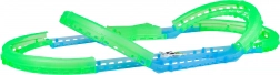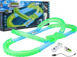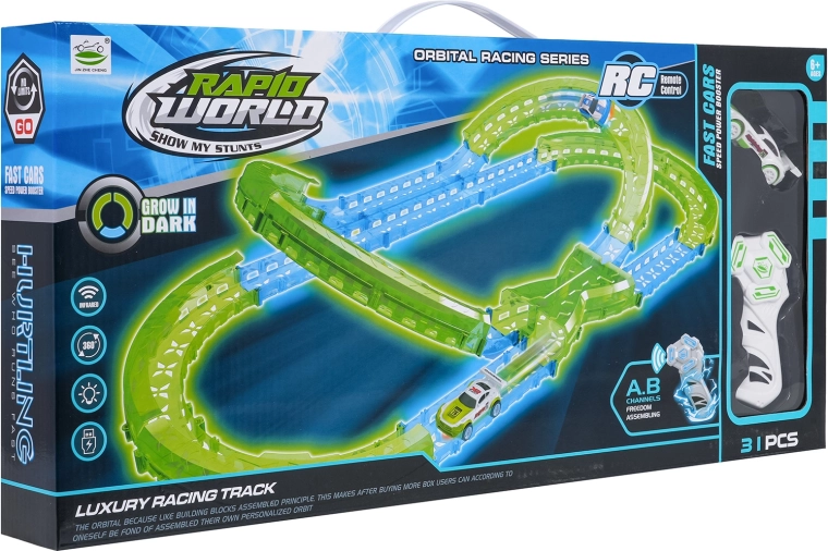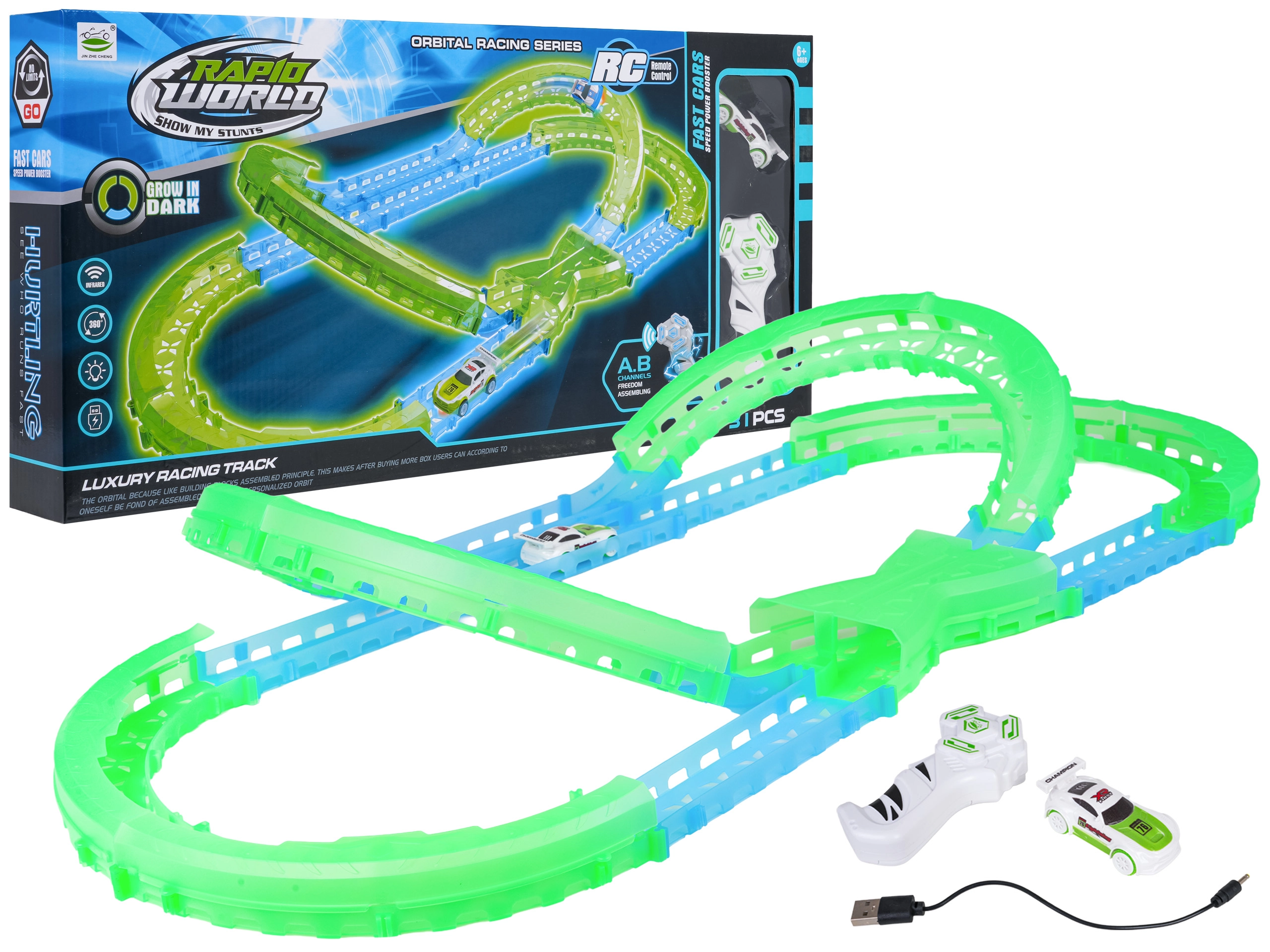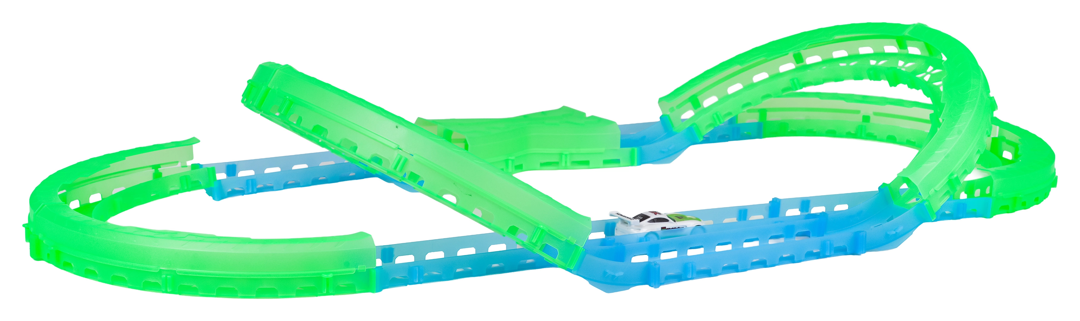 Denne store lysende racerbane er ideel til børn fra 6 år. De fluorescerende dele lyser i mørke, og bilen med LED-belysning skaber fortryllende lyseffekter under kørslen. I pakken medfølger fjernbetjening, USB-kabel til opladning og alt nødvendigt til at bygge en stabil og sjov bane.