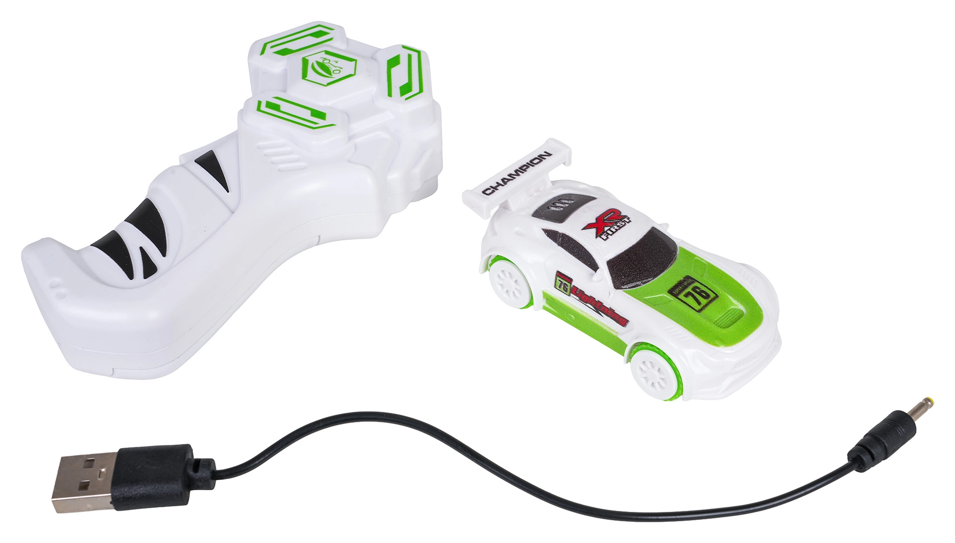 Bilen med 3,7 V batteri oplades via USB, fjernbetjeningen bruger 2× AAA-batterier (medfølger ikke). Nem betjening for børn fra 6 år.