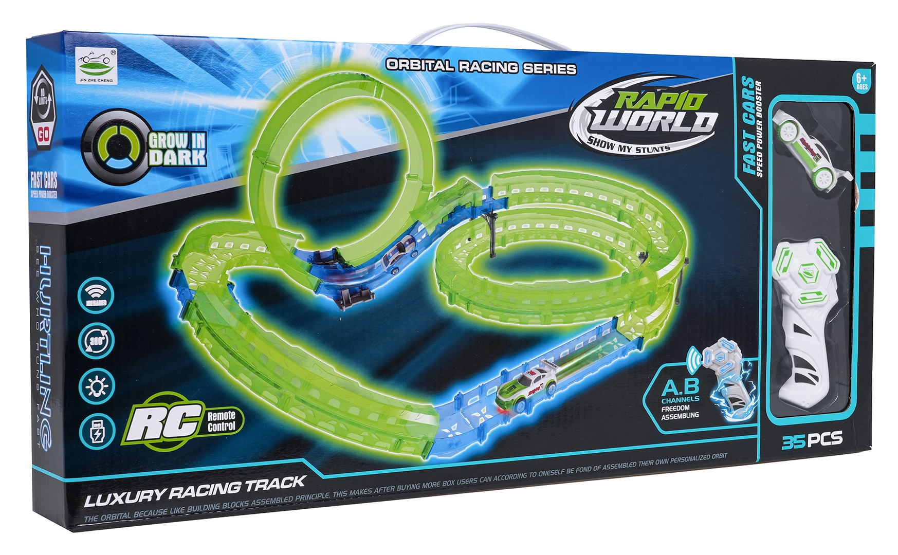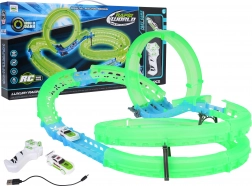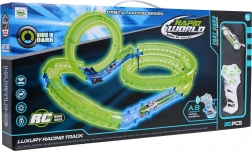 Sæt fuld fart på hjemmeracerløb med en lysende racerbane til børn fra 6 år. Sættet indeholder en RC-bil med LED-underlys, en fluorescerende bane, der lyser i mørke, og fjernbetjening. Bilen oplades via USB, fjernbetjeningen bruger AAA-batterier. Sjov leg, der udvikler koordination, fantasi og finmotorik.