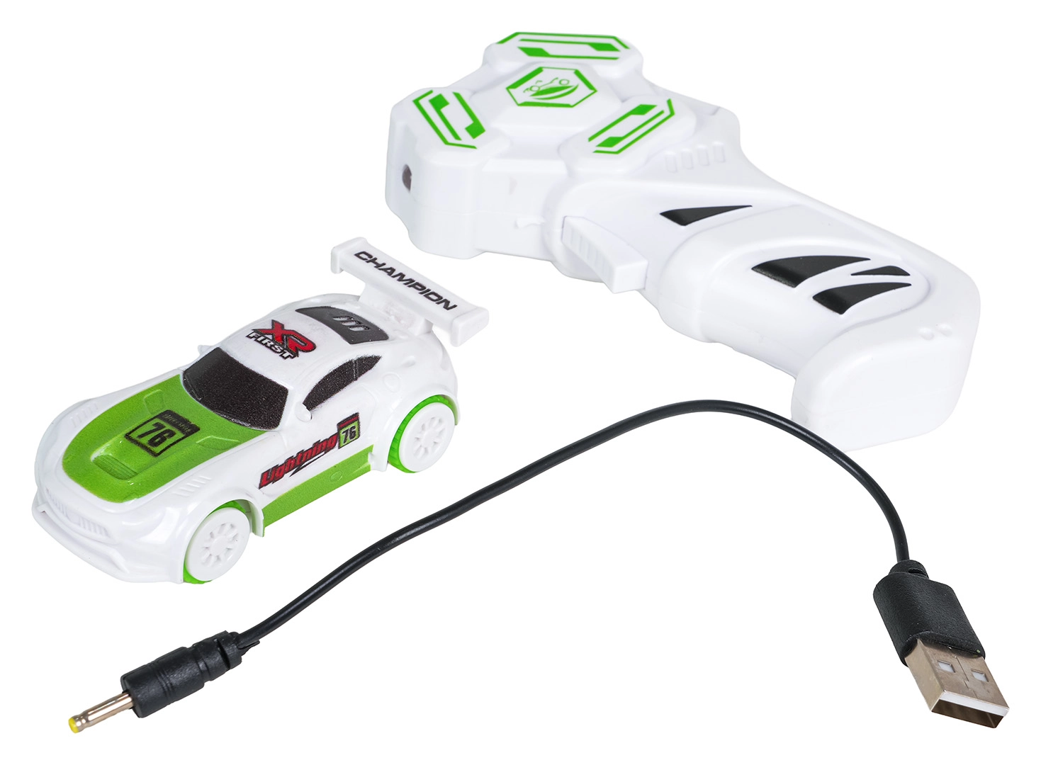 Bilen drives af et indbygget 3,7 V batteri og oplades med den medfølgende USB-kabel. Fjernbetjeningen bruger 2× AAA-batterier (ikke inkluderet). Kørsel på banen styrker koncentration og hånd-øje-koordination, mens selve byggeriet udvikler kreativitet og logisk tænkning.