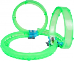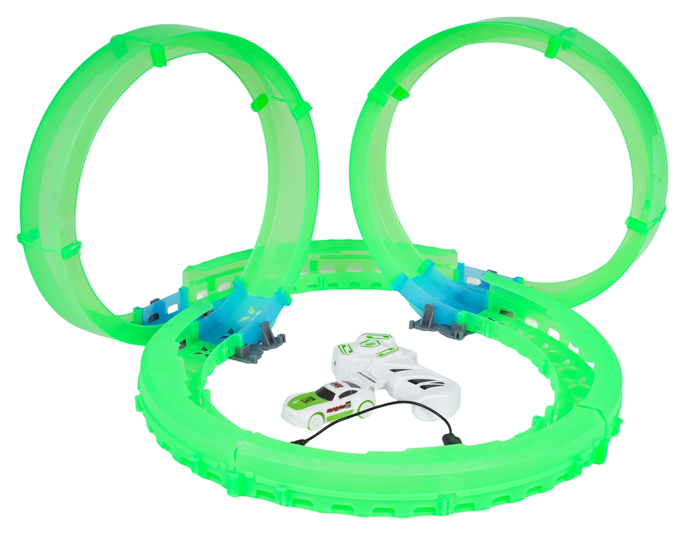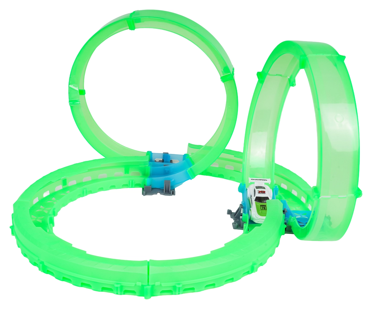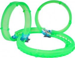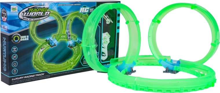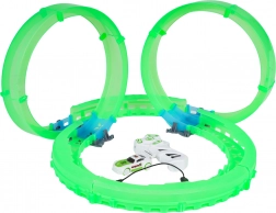 Denne kompakte racerbane med lysende, gennemsigtige dele giver actionfyldt kørsel med fængende lyseffekter. Bilen med LED-belysning suser gennem loops og kurver og efterlader en effektfuld lyssti i mørket. Med fjernbetjeningen har du altid fart og retning under kontrol.