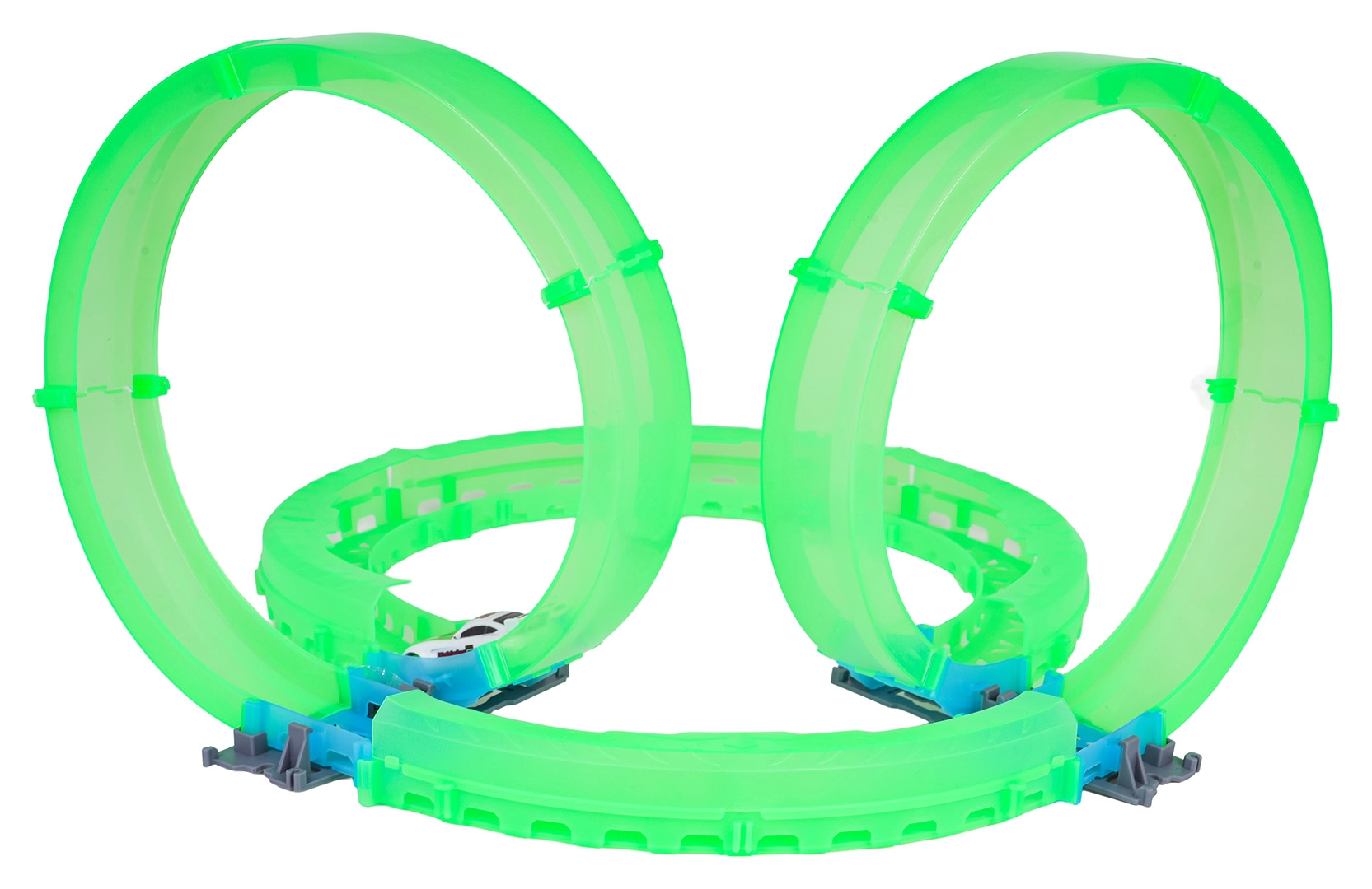 De gennemsigtige banedele lyser i mørke og giver en spektakulær køreoplevelse fuld af loops og sving.