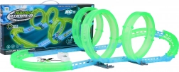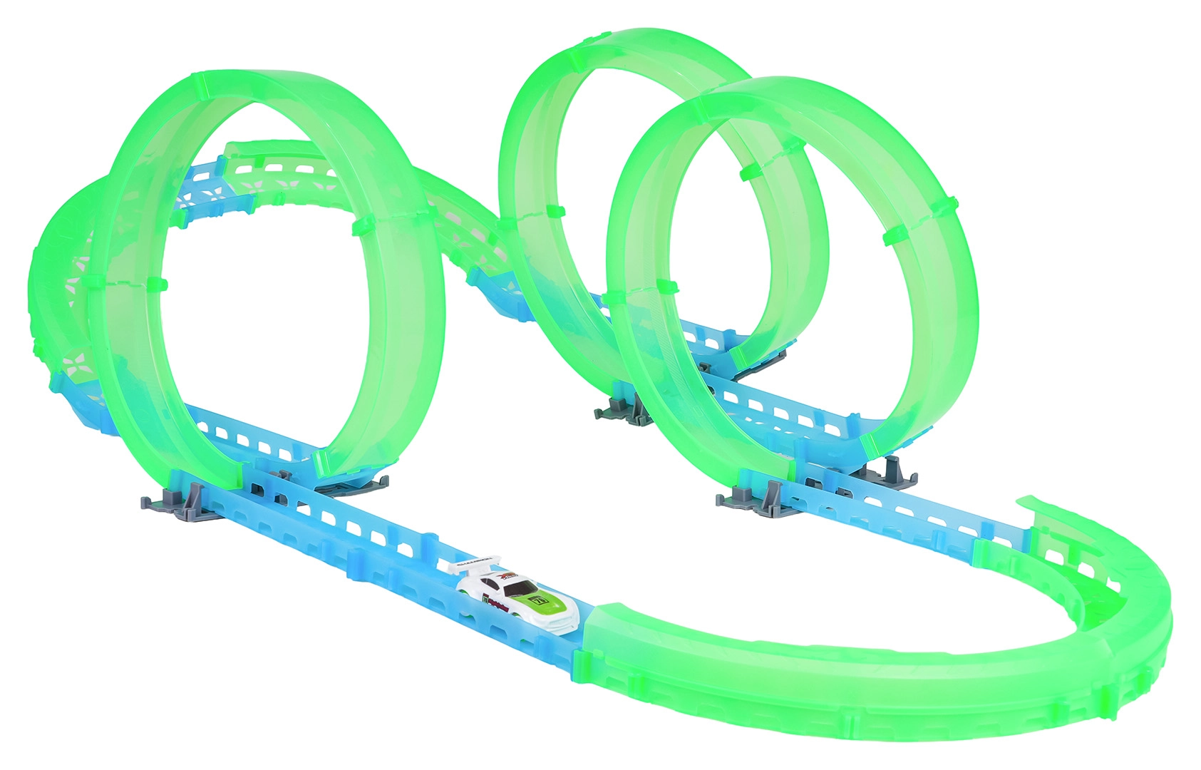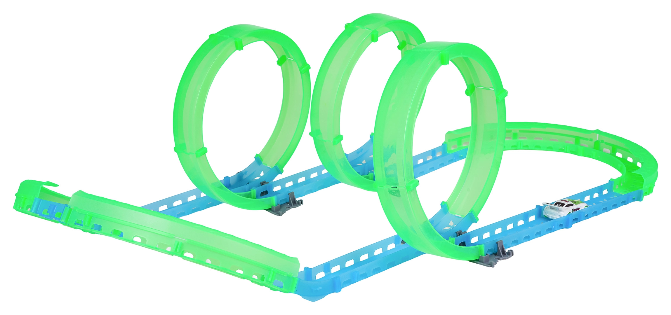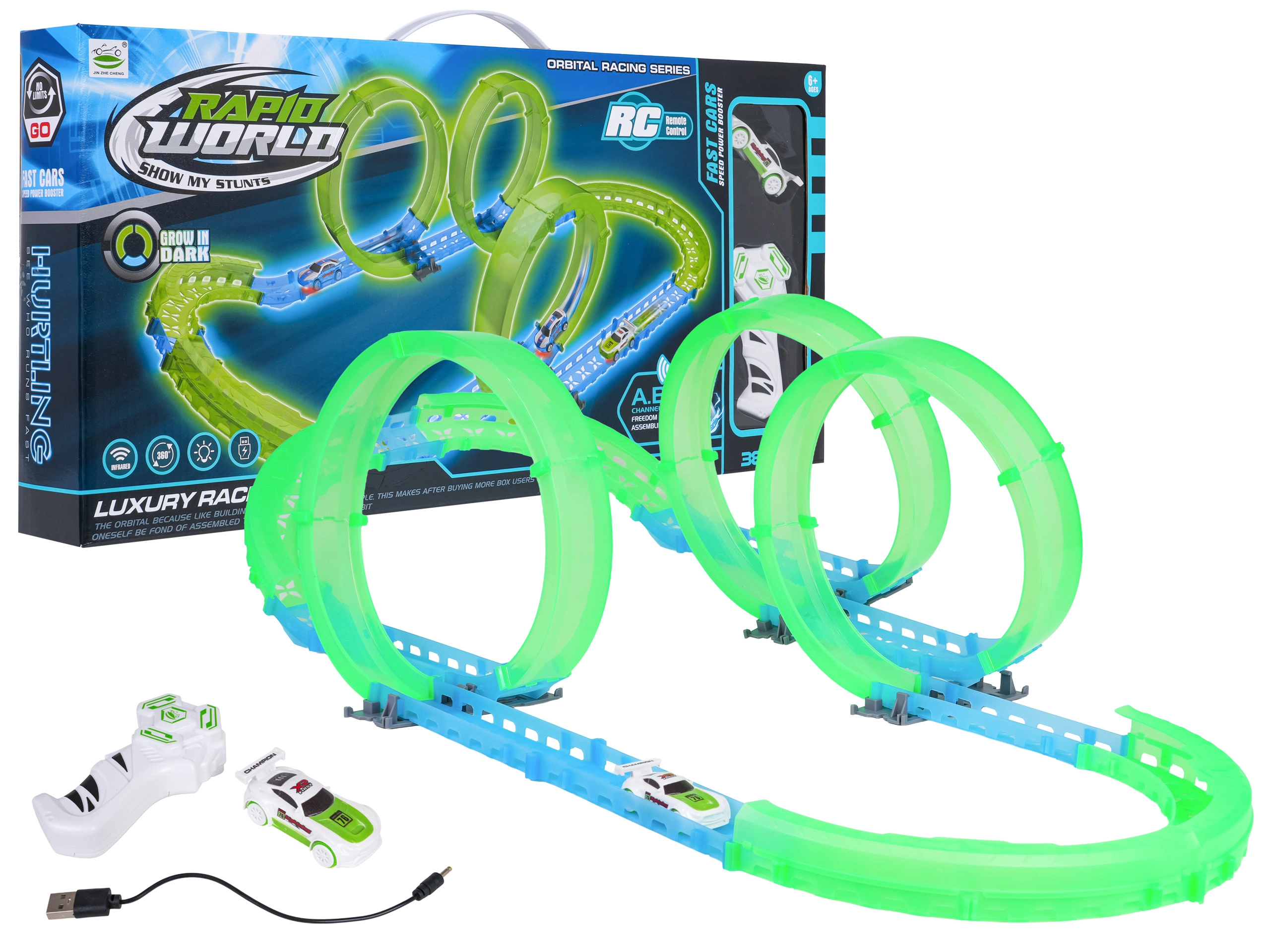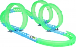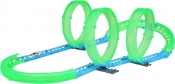 Byg din egen stuntautobane og nyd kørslen også efter mørkets frembrud. De fluorescerende elementer lyser i mørke, og den lille RC-bil kører fremad på den forberedte bane. Takket være LED-belysningen skaber den i fart effektfulde lysstriber.