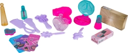 Hele 37 dele: børneføntørrer, kam, børste, spænder, pensel, læbestift, neglelak, “parfumer”, øjenskygger og andet kosmetiklegetøj.