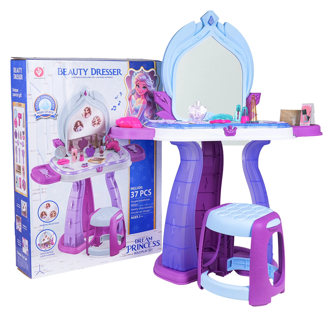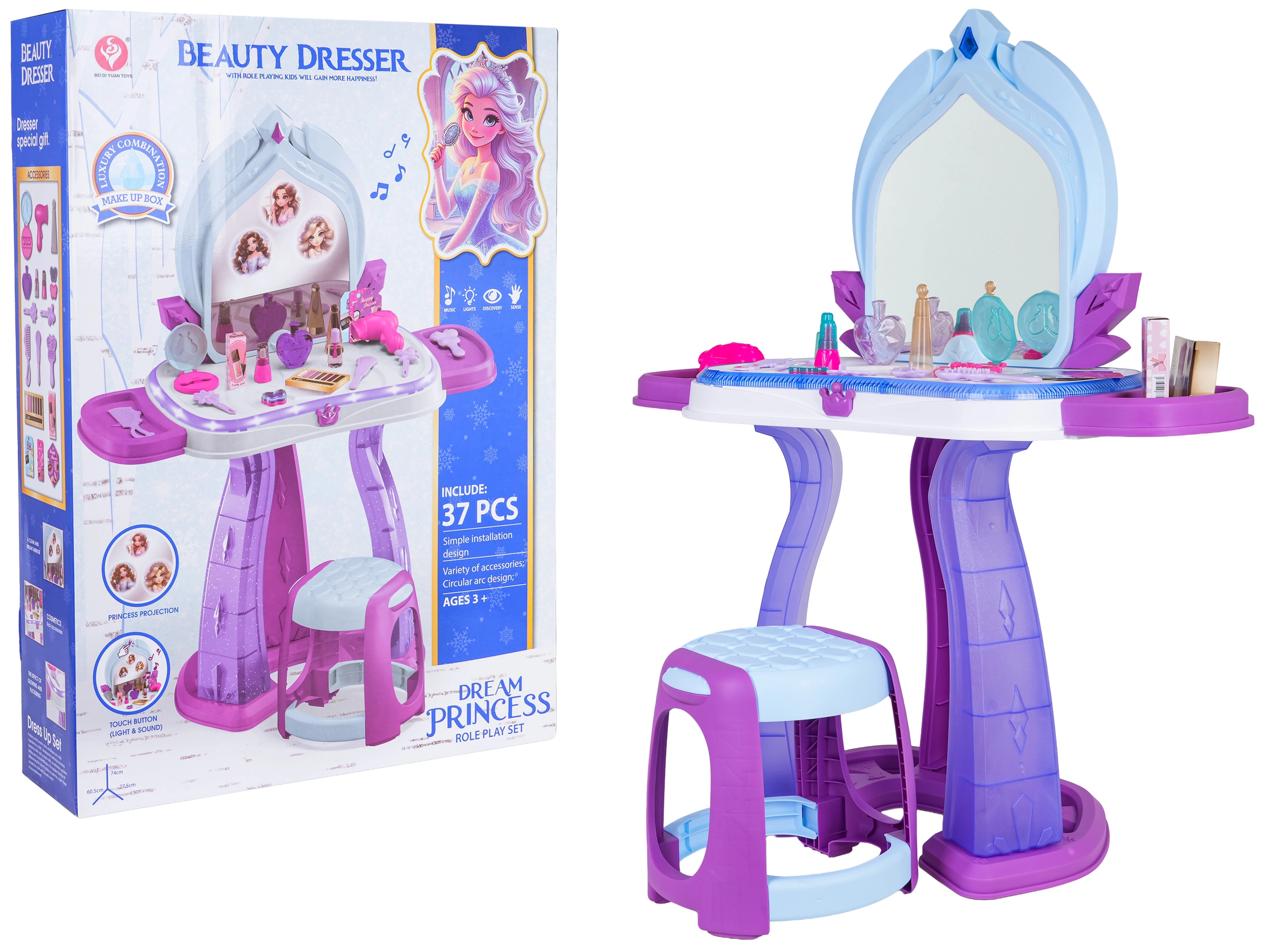 Dette magiske børnesminkebord kombinerer sikker konstruktion med interaktiv underholdning. Rundt om bordpladen lyser blid belysning, og på spejlet vises prinsessebilleder ledsaget af glade melodier. Takket være det rige tilbehør kan børn prøve rolleleg med sminke, frisering og pleje af udseende.