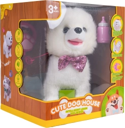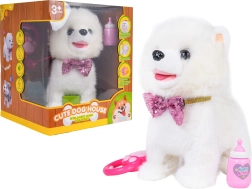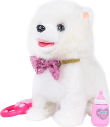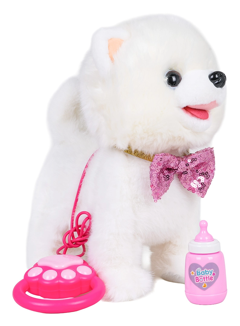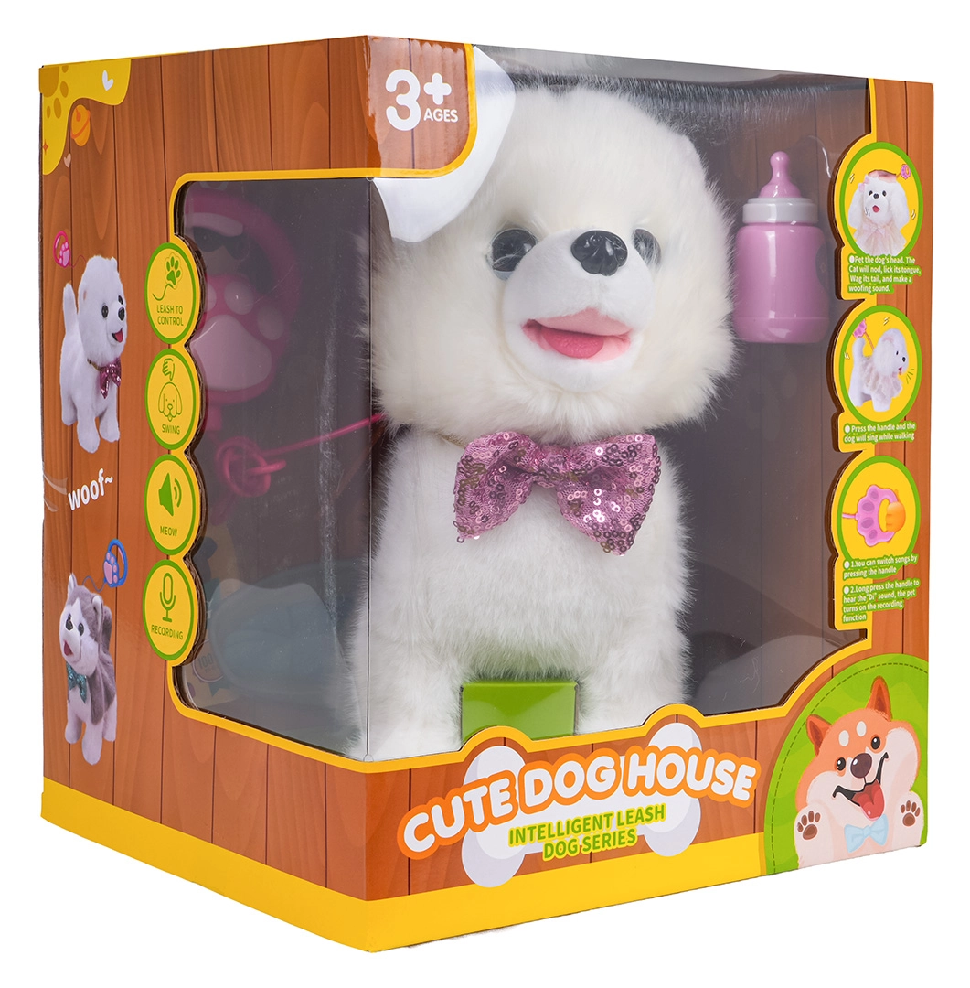 En sød hvid interaktiv hund til børn fra 3 år giver masser af sjov og hygge. Den er lavet af bløde og sikre materialer, kan gå, gø, vifte med halen, nikke med hovedet og endda slikke med tungen. Takket være fjernbetjeningen/snor reagerer den på et tryk, går i takt til musik og har optage- og afspilningsfunktion, så den sødt gentager dine ord. Der medfølger også en fodringsflaske for en endnu mere realistisk leg.