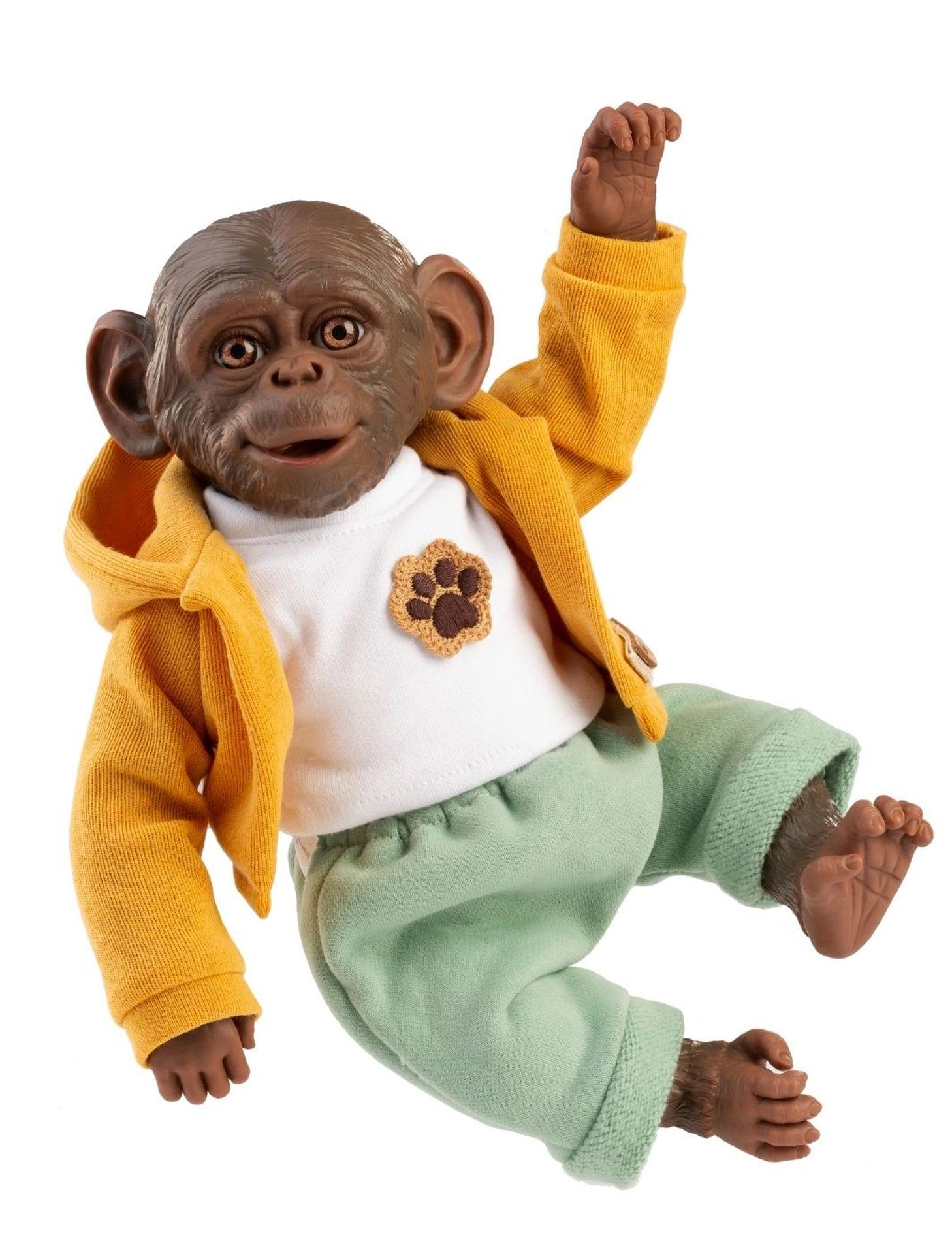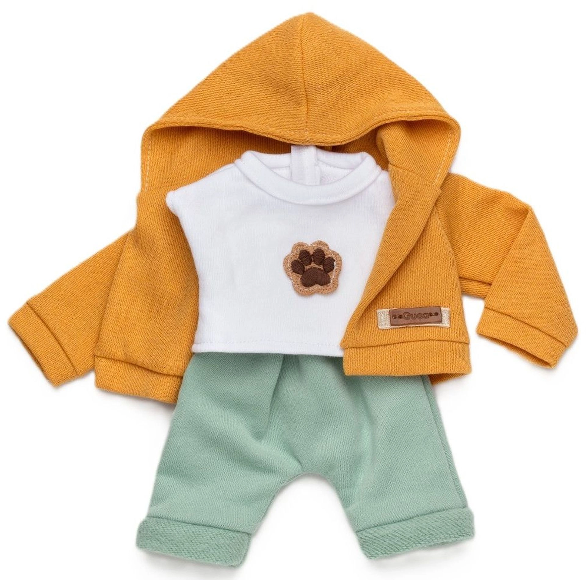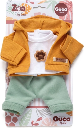 Giv din Reborn-abe på 32 cm en unik stil. Dette 3-delte sæt kombinerer komfort og et sødt design: en sennepsgul hættebluse for varme og stil, en hvid T-shirt med påsyet pote og mintfarvede bukser med bløde manchetter for perfekt pasform. Tøjet er designet til hyppig omklædning og nem vedligeholdelse.