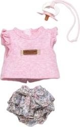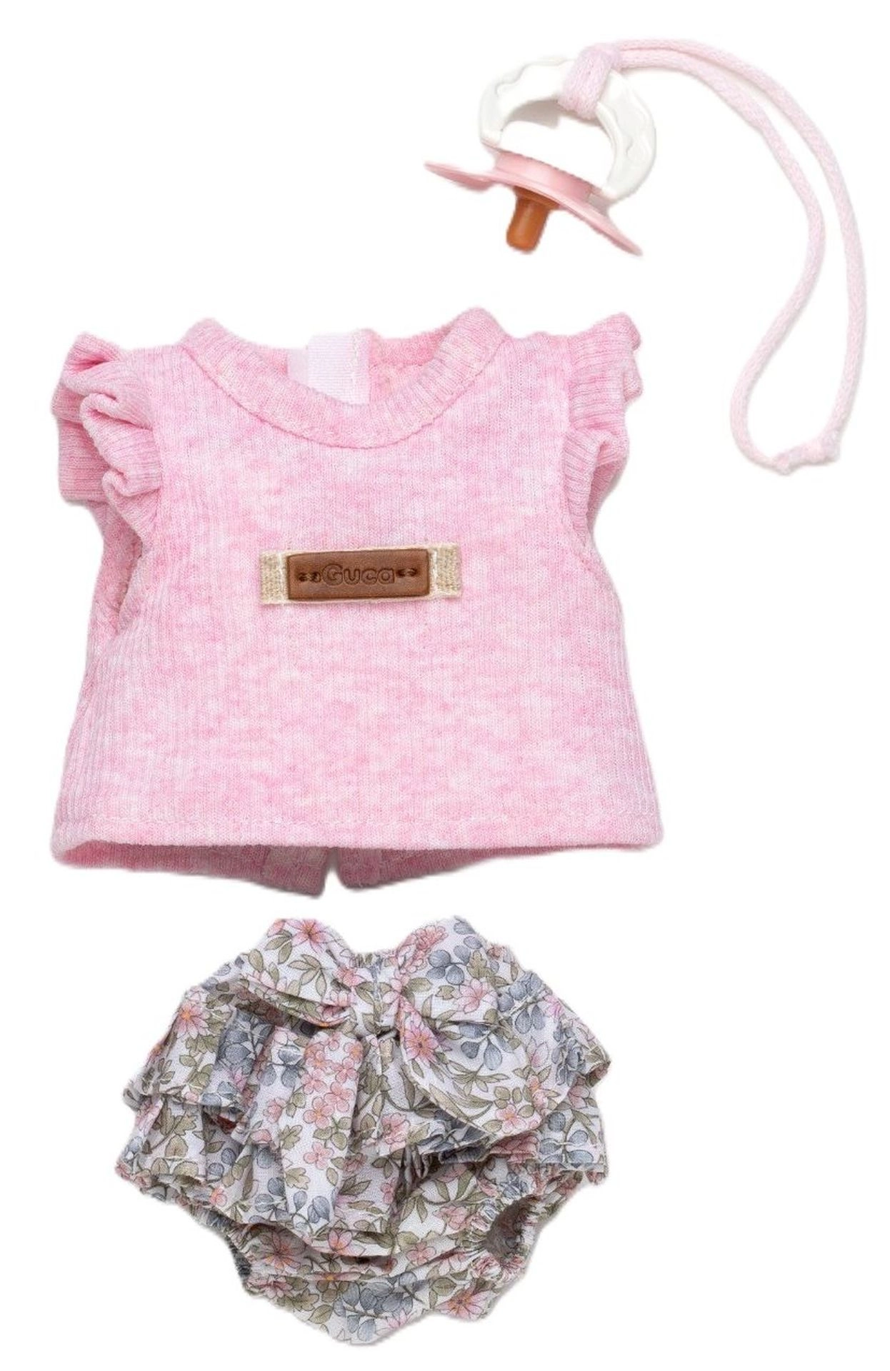 Lyserød top med flæser, blomstrede bloomers og en sut danner et perfekt matchende sæt til daglig leg og udklædning.