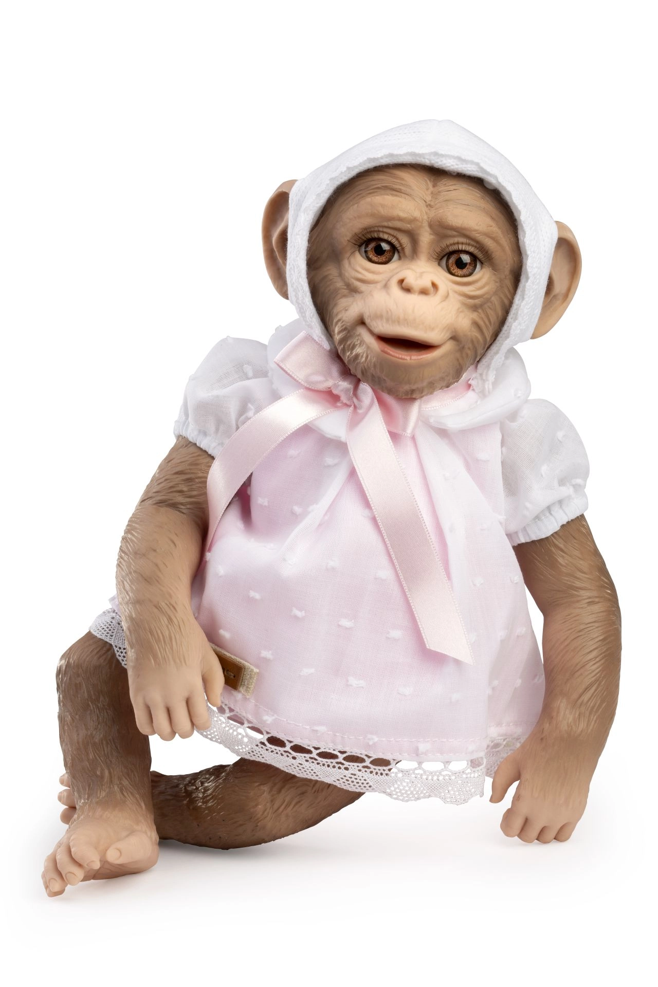 Dette elegante sæt inkluderer en lyserød kjole med hvid krave og blonde, matchende bloomers og en strikket hvid hue med lyserødt bånd. Omhyggelige detaljer som let prikket stof, blondekanter og behagelige pasformer giver din Reborn-abe et autentisk og charmerende udtryk.