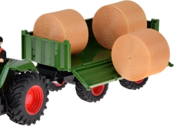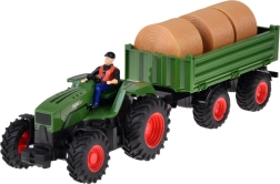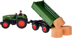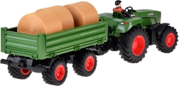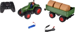 - Traktor, anhænger, førerfigur, 3× høballe, 3,7 V akkumulator, USB-opladerkabel, fjernbetjening