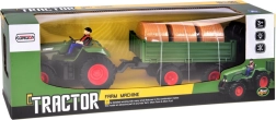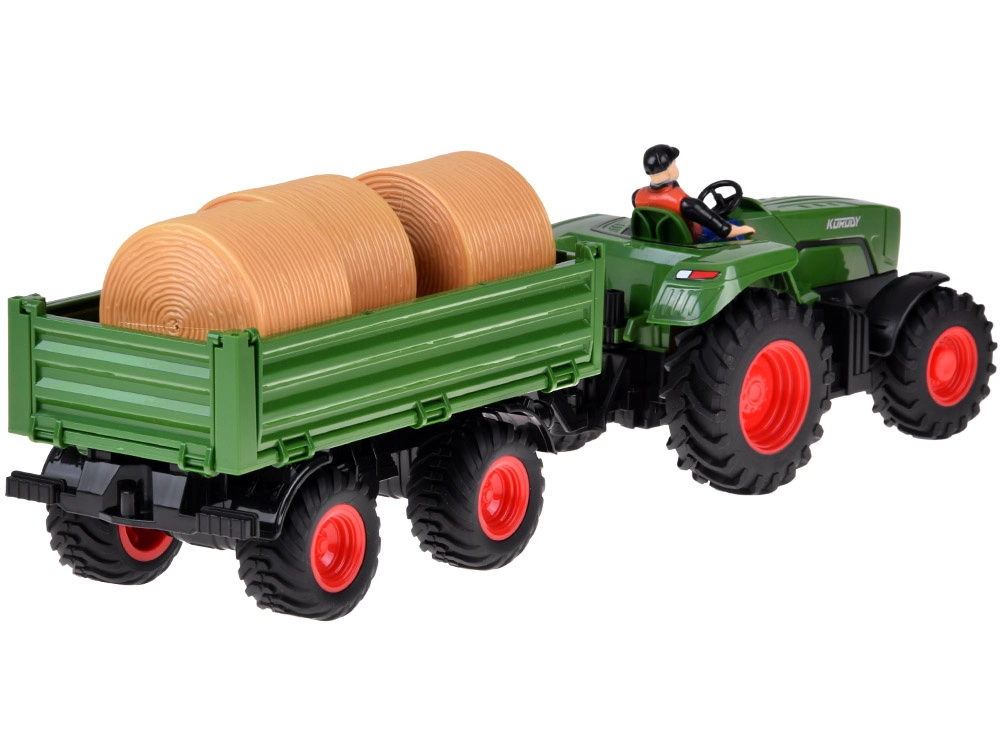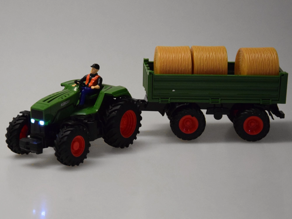- Komplet sæt: traktor, anhænger, 3× høballe, førerfigur, 3,7 V akkumulator, USB-kabel, fjernbetjening