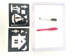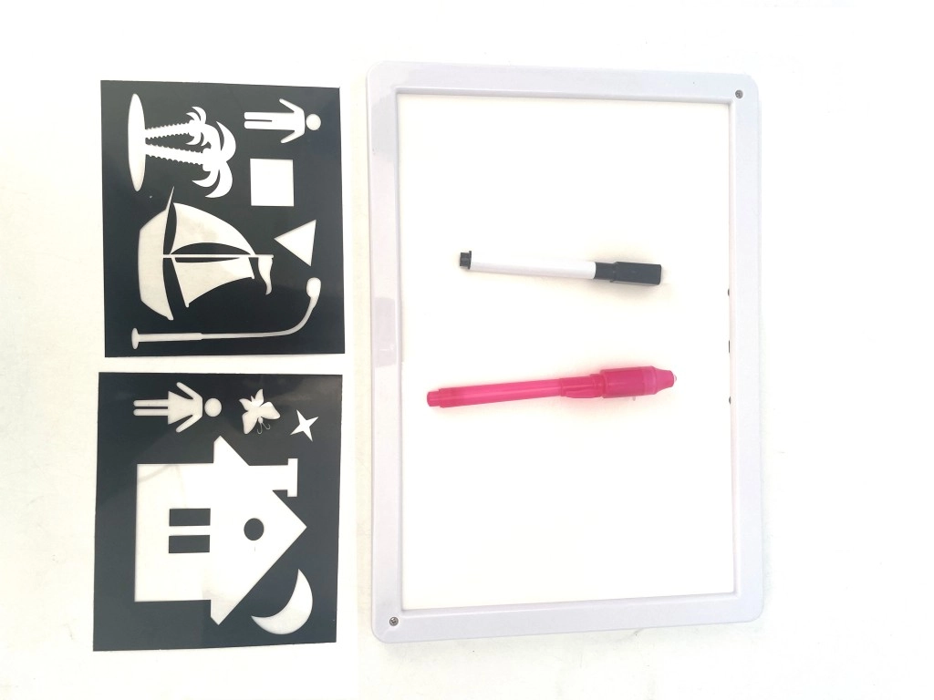 Oplev sjov uden rod med et kreativt redskab til børn fra 3 år. Denne lette tegnetavle i A4-format gør det muligt at tegne med en speciel lysende pen og skabe magiske billeder, der lyser i mørke. Takket være den dobbeltsidede udformning tilbyder den dobbelt anvendelse – lysende tegning og almindelig tegning på en hvid overflade. I pakken finder du 2 penne, formesabeloner og LR44-batterier til øjeblikkelig brug.