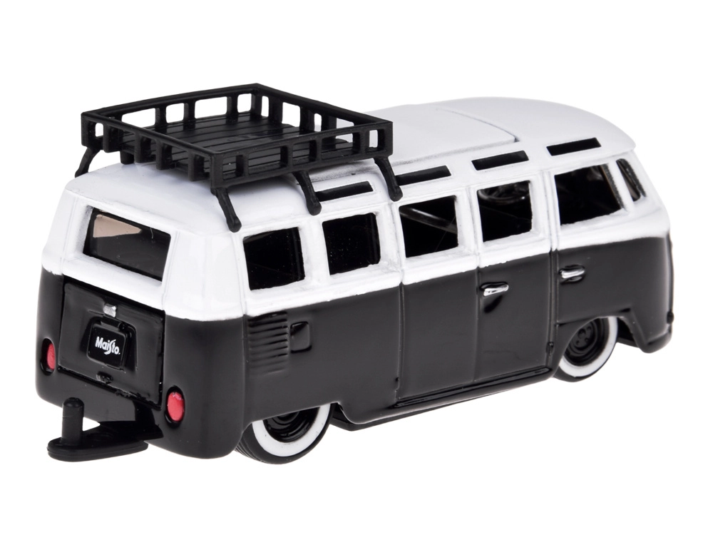 Metalkarosseri, realistiske vinduer, hjul og tagbøjle. Præcise proportioner og en diskret sort‑hvid farve fremhæver det retro præg.