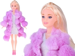 Dukken med langt blond hår, glitrende kjole og blød lyserød/lilla pelsjakke giver legen elegance og kreativitet.
