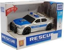 Sølvfarvet politibil i målestok 1:20 vil glæde små actionfans. Takket være lys- og lydeffekter, tre knapper på taget og friktionsmotor kan børn lege realistiske indsatser. I pakken medfølger batterier, der er også åbning af bagagerum og sikkerhedscertificering CE.