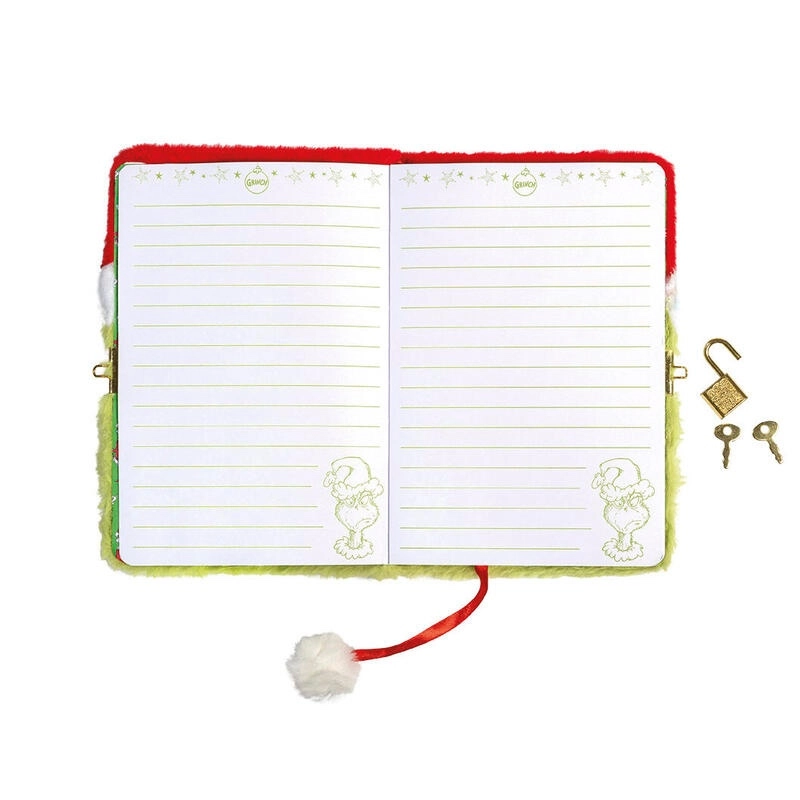 Forkæl dig selv med en stilfuld notesbog med plyscover og et markant GRINCH-motiv. Takket være A5-formatet passer den nemt i rygsækken eller tasken, så du altid kan have den ved hånden. Lås med to nøgler beskytter dine noter, din dagbog og dine skitser.