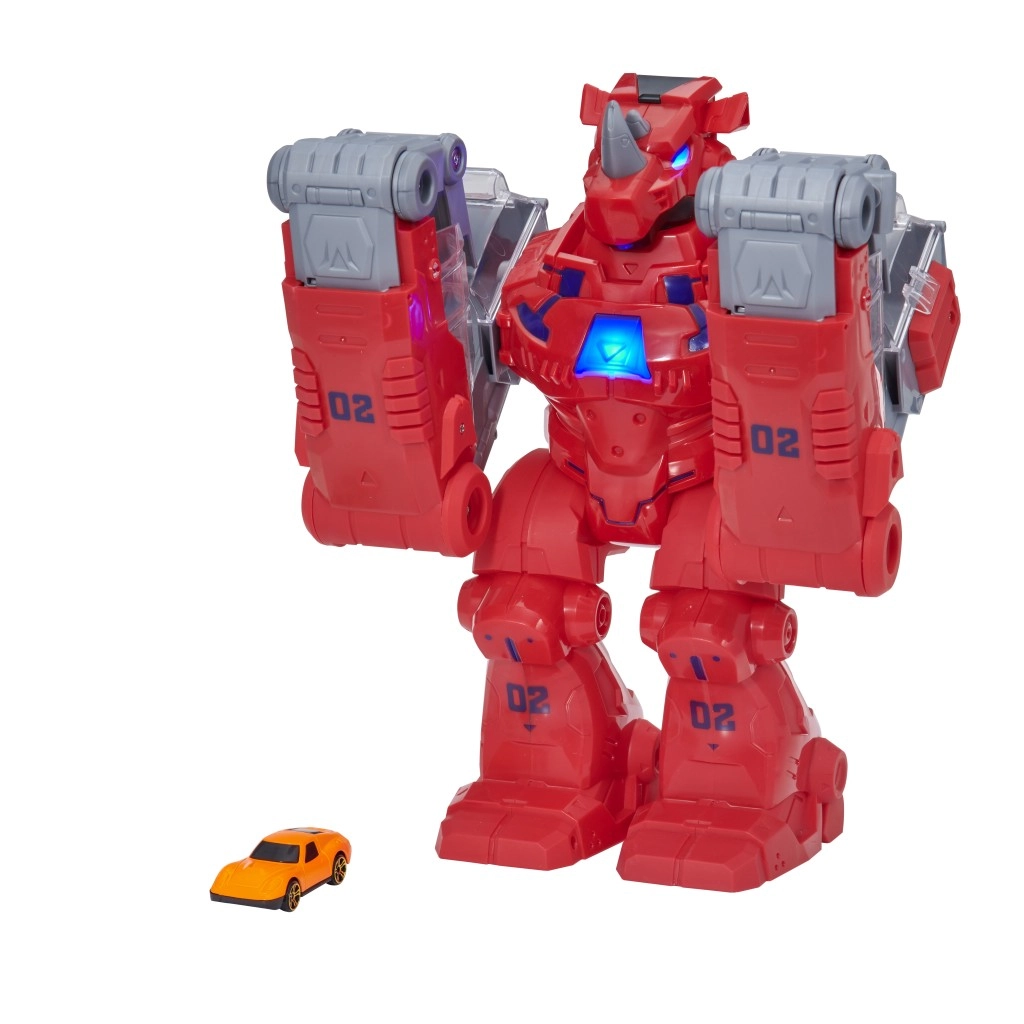 Teamsterz Robo Wreckerz Rhino Slam giver børn en dynamisk legeoplevelse. De robuste arme åbnes, du læsser bilen på, og ved at trykke på næsehornets hoved affyres bilen gennem de gennemsigtige baner ned gennem begge arme. Blåt lysende LED-øjne og lyseffekter på brystet sammen med brølende lyde forstærker actionstemningen.