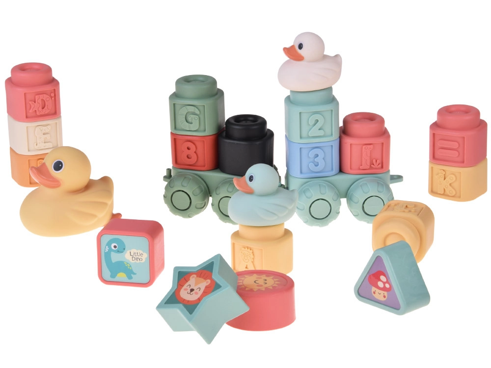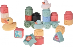 Takket være reliefmotiver af bogstaver, tal, dyr og former opdager børn let de første begreber, udvider ordforrådet og udvikler før‑matematiske færdigheder. Sættet er også velegnet til badekar eller pool – delene flyder, ællingerne glæder ved hvert bad, og byggeelementerne kan også stables uden for vandet.