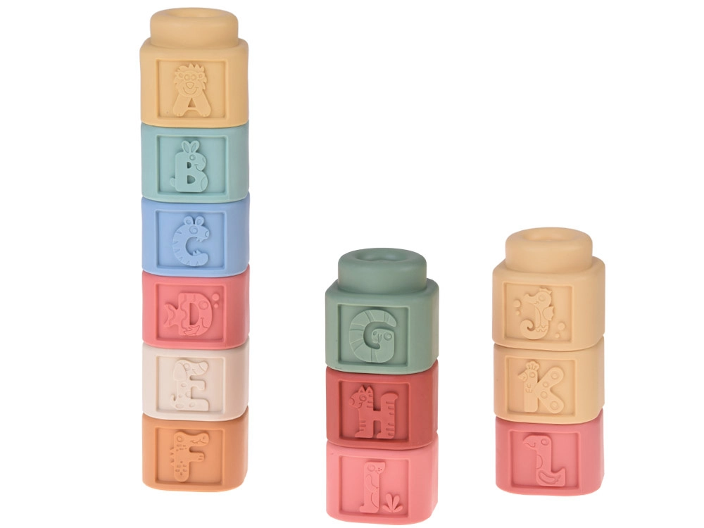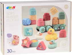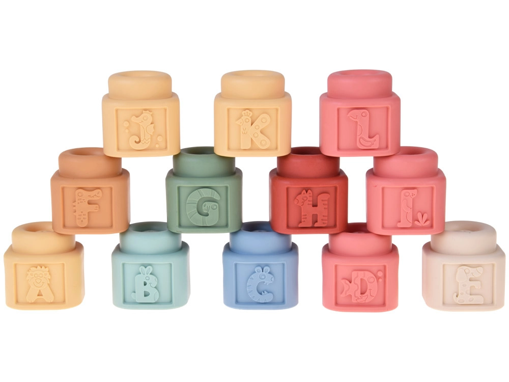 Sjovt og sikkert sæt til de mindste: bløde pastelfarvede klodser med reliefbogstaver, tal og dyr suppleret med søde badekyllinger. Elastisk og ikke‑giftig silikone/gummi er behagelig at røre ved, egnet til små hænder og som bidering. Understøtter finmotorik, hånd‑øje‑koordination, læring af farver, former og tal og giver masser af kreativ leg både hjemme og i vand.