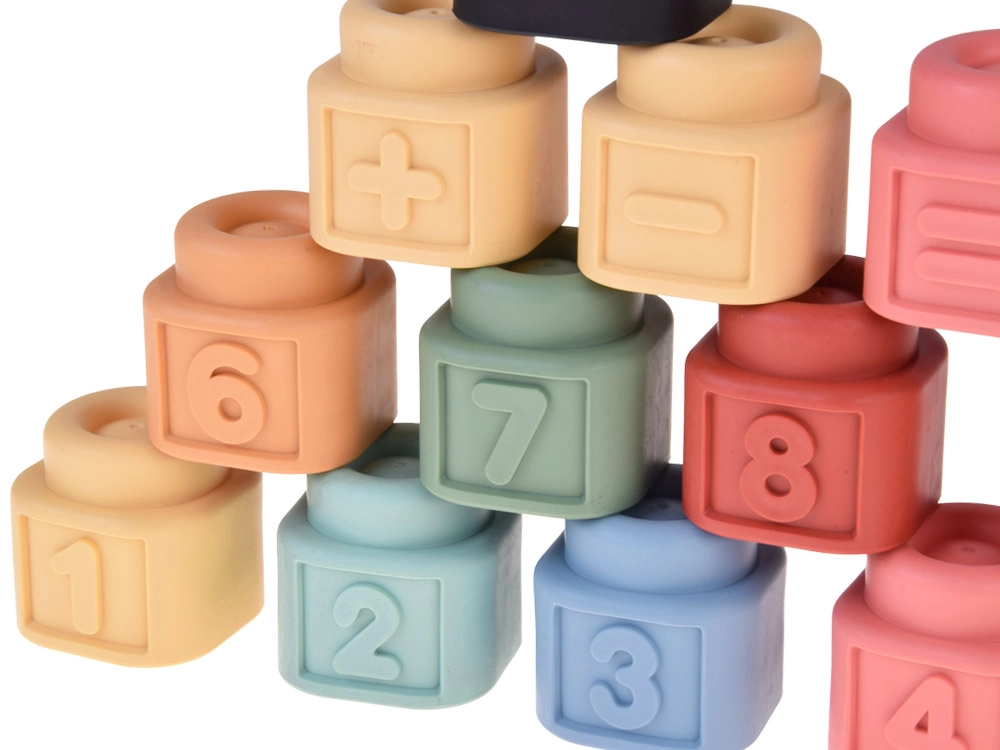 Blødt, sammenklemeligt og ikke‑giftigt materiale ligger godt i hånden og er skånsomt mod gummerne – klodserne kan også bruges som bidering. Afrundede kanter øger sikkerheden under leg.