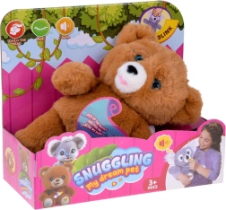 Den interaktive bjørn er lavet af blød og behagelig plys i en brun nuance og er ideel til både hygge og ro før sengetid. Med følger en fodringsflaske, som hjælper barnet med at øve omsorg, reagere på behov og udvikle empati. De realistiske bevægelige øjne, der åbner og lukker, giver legen autenticitet.
