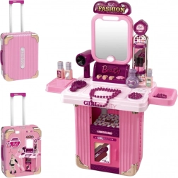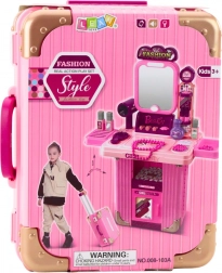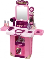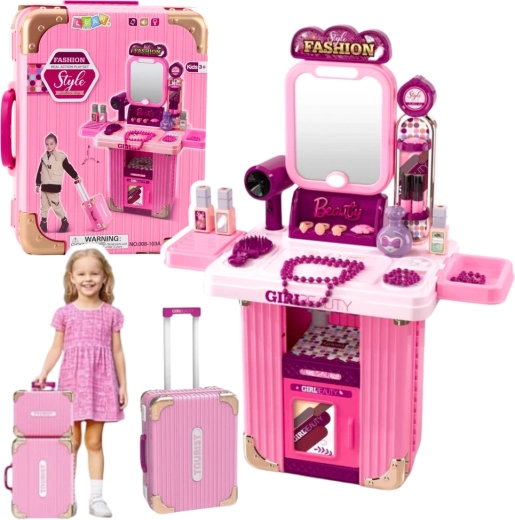 Stilfuldt børne-toiletbord 2-i-1 i en praktisk kuffert, som ved udklapning forvandles til et magisk kosmetikbord. Byder på belyst spejl, lydeffekter og masser af tilbehør til legesalon. Let og mobil takket være hjul og udtrækkeligt håndtag, fremstillet af sikre materialer – understøtter kreativitet, fantasi og finmotorik.