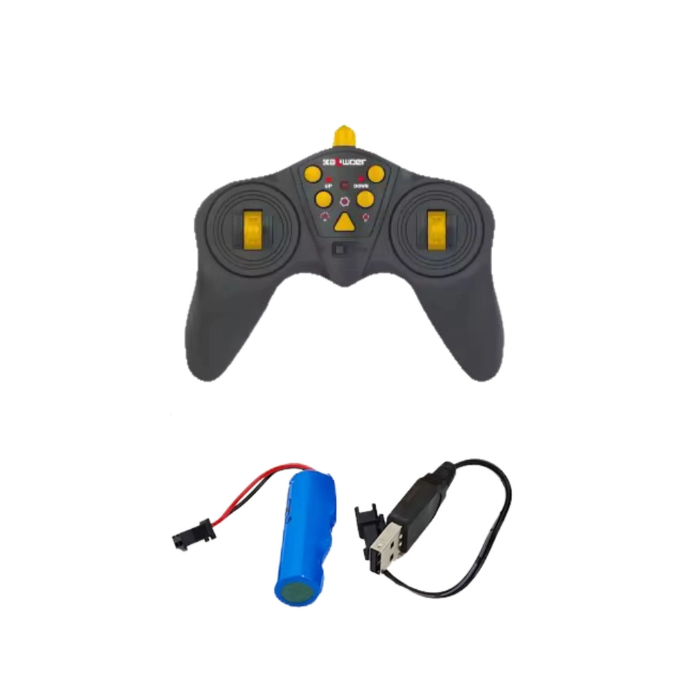 I pakken finder du en dobbelt-joystick controller, et genopladeligt 3,7 V batteri og et USB-kabel – du skal blot indsætte AA-batterier i controlleren og køre.