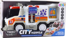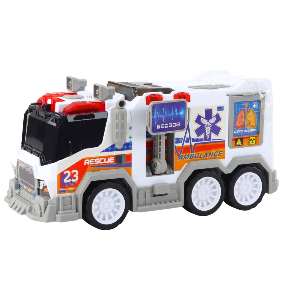 Denne detaljerede ambulance imponerer med en populær hvid-rød farvekombination med blå elementer og markante medicinske prints. Ved tryk på knapperne aktiveres sirenelyde og lyseffekter, som giver actionfyldte redningsscenarier ægthed.